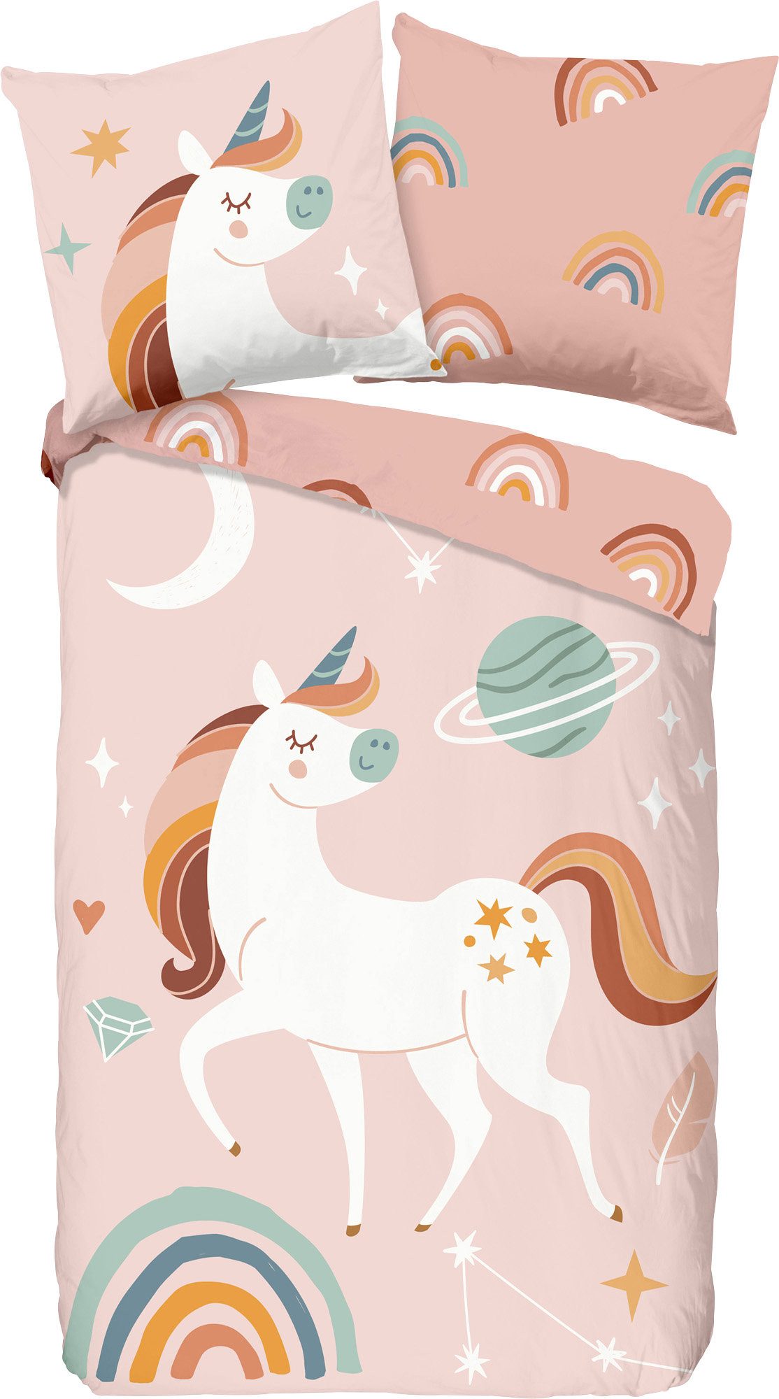 Good Morning Flanell Kinder-Wendebettwäsche "Unidance". Das liebevoll gezeichnete Einhorn-Motiv lässt die Herzen höher schlagen. Auf der Rückseite setzt das Allover-Regenbogen-Muster einen gelungenen Kontrast. Welch ein Genuss, sich in die wolkenweiche, samtig angeraute Wohlfühlqualität zu kuscheln. Sie verwöhnt mit wohliger Wärme, fühlt sich herrlich soft auf der Haut an, ist temperaturausgleichend und atmungsaktiv. Unkompliziert zu beziehen durch den praktischen Reißverschluss.