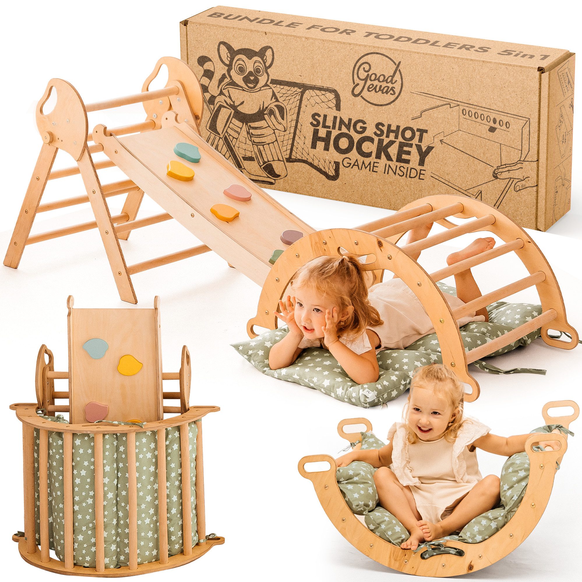 Warnhinweise | Dieses Produkt ist für Ihr Baby sicher. Während des Spielens wird die Aufsicht durch Erwachsene empfohlen. Lassen Sie ein Kind niemals unbeaufsichtigt. Wir übernehmen keine Verantwortung für Unfälle. Die Farbe des Produkts kann leicht variieren (heller/dunkler), da es aus Naturholz hergestellt ist. Nur für den Innenbereich geeignet. Wir empfehlen, das Produkt nicht im Freien zu verwenden, da Sonnenlicht und Regen die Holzkomponenten beschädigen können. Unsere Garantie deckt keine Schäden ab, die durch Witterungseinflüsse entstehen, wenn Gegenstände im Freien gelassen werden. |