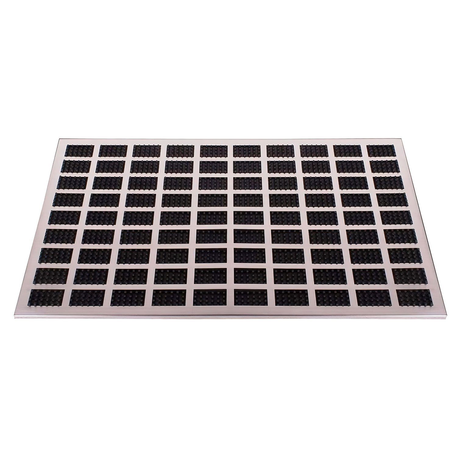Luxus Fussmatte aus bestem Aluminium in Kombination mit speziellem PVC-Gummikunststoff für eine perfekte Reinigung aller Schuhe und Stiefel. Dank der 90 integrierten Reinigungseinsätze sowohl für den Innen- als auch den Außenbereich bestens geeignet. Die Basis aus hochwertigem Edelstahl verleiht dem Design-Fußabtreter einen puristischen und luxuriösen Designcharakter. Maße: ca. 60 x 40 x 1,8 cm. Die Fußmatte ist sowohl enorm robust und langlebig als auch funktionell und stylisch.