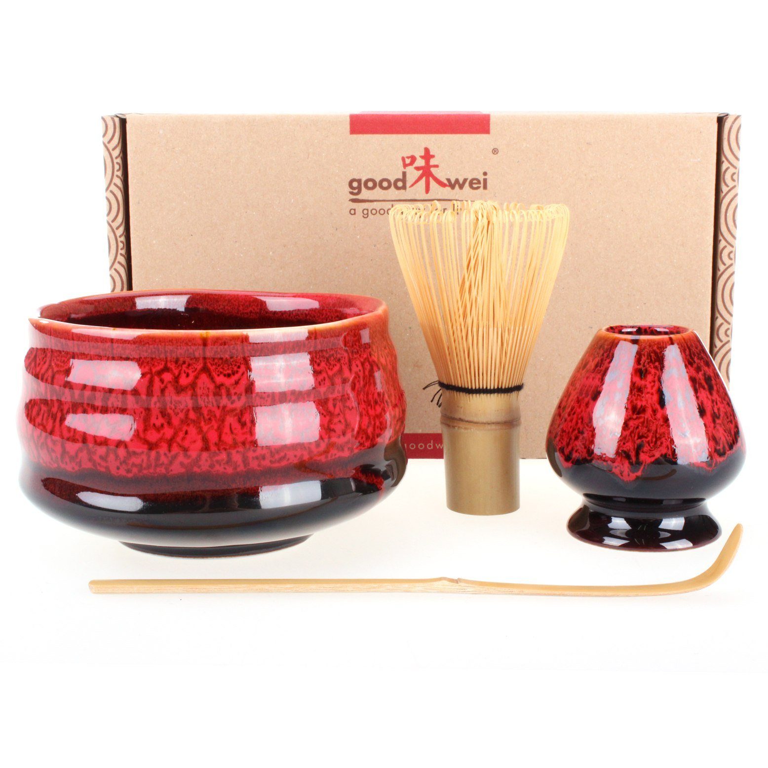 Handgearbeitet umfasst das Deluxe Matcha-Set "Yogan" eine klassische Matcha-Schale mit unregelmäßiger Form und welligem Rand, die die Hügel Japans repräsentiert. Die feurig-dunkelrote Glasur erinnert an über den schwarzen Untergrund fließender Lava. Das Set enthält einen weißen Bambus-Chasen mit 120 Borsten und einen Matcha-Löffel "Chashaku" zur Dosierung des Pulvers. Großzügig dimensioniert bietet die Schale ausreichend Platz, um den Matcha Tee schön schaumig zu schlagen.