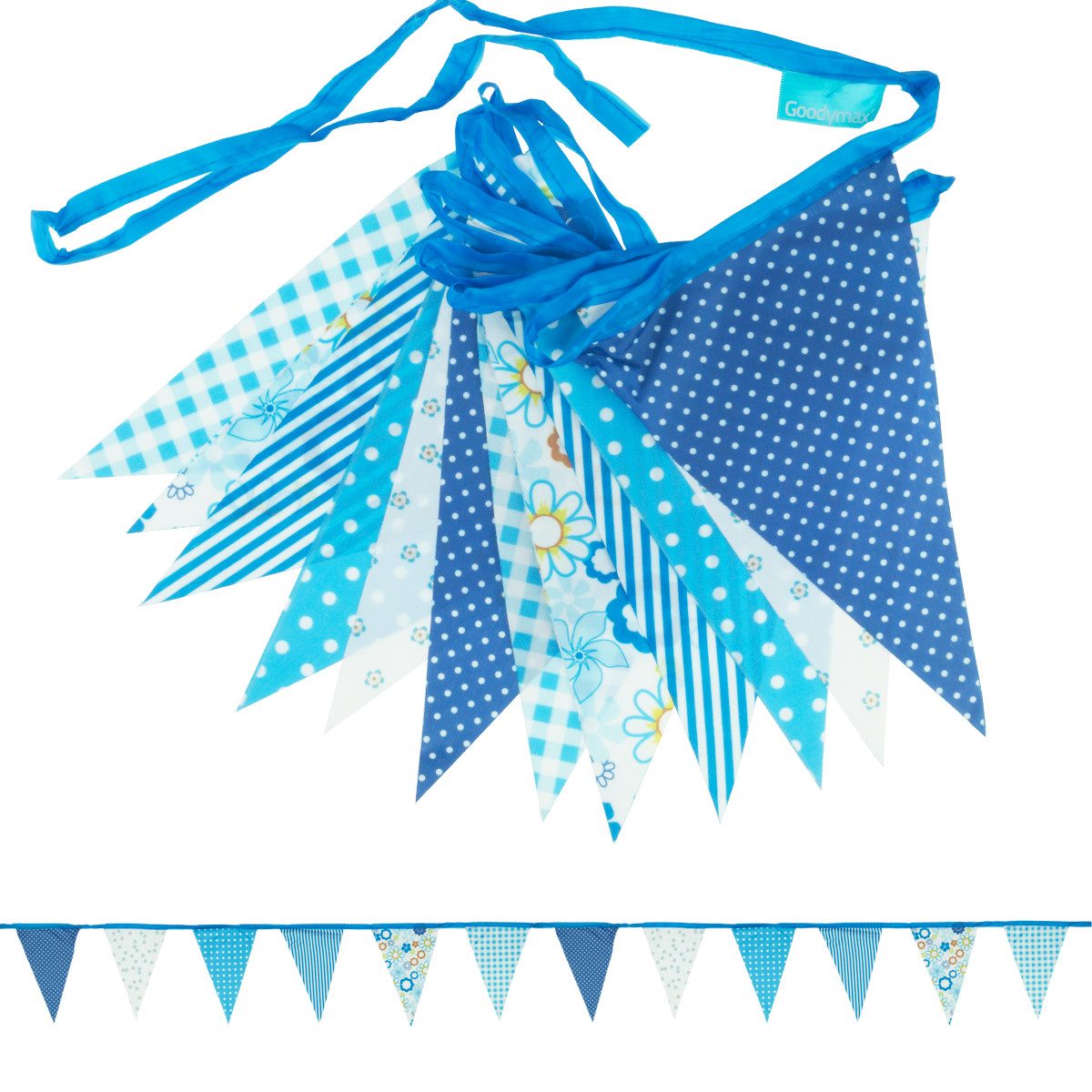 Farbe: 6 verschiedene blaue Designs (Farbe/Muster beidseitig); Menge: 1 Stück; Длина: ca. 3,50 m; Wimpelgröße: ca. 14 x 20 cm; Material: Polyester