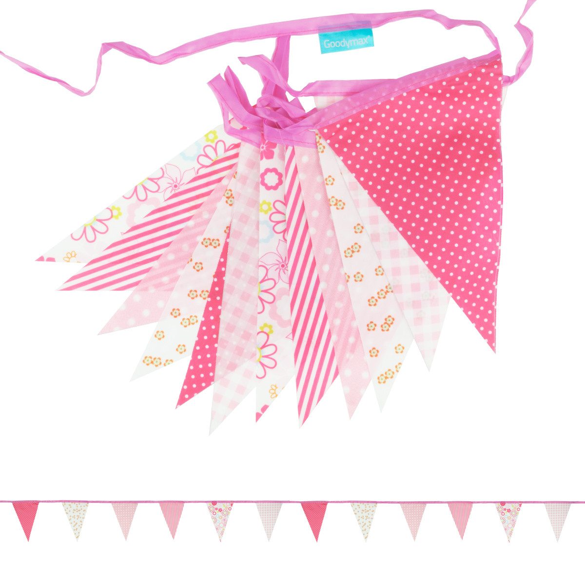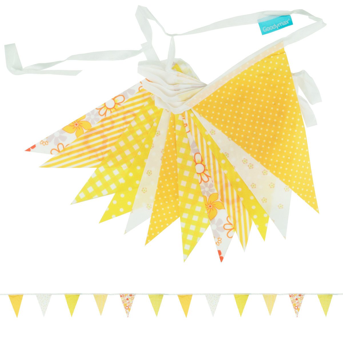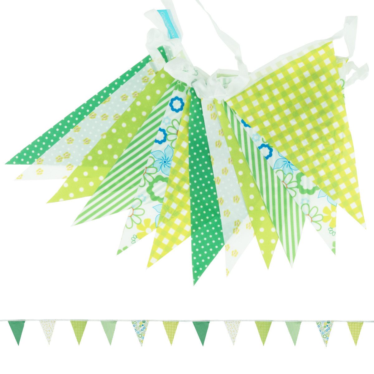 Farbe und Muster sind beidseitig. Die Fähnchen haben eine dreieckige Form und bestehen aus Polyester. Das Band besteht ebenfalls aus Polyester-Stoff.