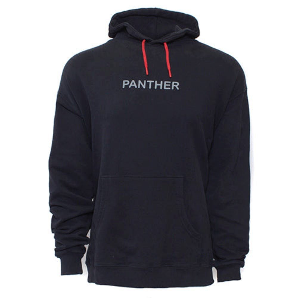 Der kontrastierende rote Kordelzug und das Panther-Motiv auf der Vorderseite verleihen dem Hoodie einen rebellischen Touch. Das Carbon-Wash-Finish verleiht ihm einen modernen, leicht verwaschenen Look, während der Siebdruck auf der Rückseite das majestätische Panther-Motiv zeigt.
