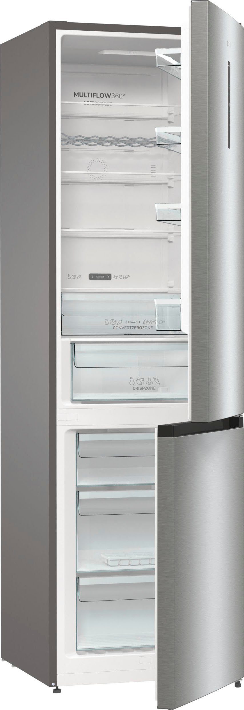 Die »NK89C0DXL« ist eine freistehende Kühl- und Gefrierkombination von GORENJE und überzeugt mit hoher Funktionalität sowie der Energieeffizienz-Klassifizierung C (Skala Energieeffizienz-Klassifizierung A bis G). Viel Platz bietet das 60 x 200 x 66,3 cm (B/H/T) große Gerät mit seinen 106 l Gefriervolumen und 255 l Kühlvolumen. Das Betriebsgeräusch des Modells liegt bei 35 dB. Regelmäßiges Abtauen ist mit der No Frost-Funktion passé – ein Umluftsystem leitet die Luftfeuchtigkeit aus dem Gefrierraum ab, wodurch das Gerät nie wieder abgetaut werden muss. Obst und Gemüse bleiben dank der CrispZone-Schublade länger frisch und knackig. Zur optimalen Lagerung von Fleisch, Fisch, Obst und Gemüse erzeugt die FreshZone-Schublade einen konstanten Temperaturbereich von ca. 2-5 °C. Drei Gefrierschubladen stehen ebenso zur Verfügung, um den Einkauf zu verstauen. Das auf der Tür installierte Display zeigt die genaue Temperatur im Gerät an. Auf fünf Ablageflächen aus Glas ist in der Kühl- und Gefrierkombination viel Platz für Lebensmittel. Zusätzliche Flexibilität bei der Lagerung bieten die vier Türablagen. Steht die Tür zu lange offen, gibt die Kühl- und Gefrierkombination ein akustisches Warnsignal. Всеs im Blick hat man außerdem dank der LED-Innenbeleuchtung. Wer auf der Suche ist nach einem Modell, das genug Platz für Lebensmittel bietet, der trifft mit der »NK89C0DXL« von GORENJE eine gute Wahl.