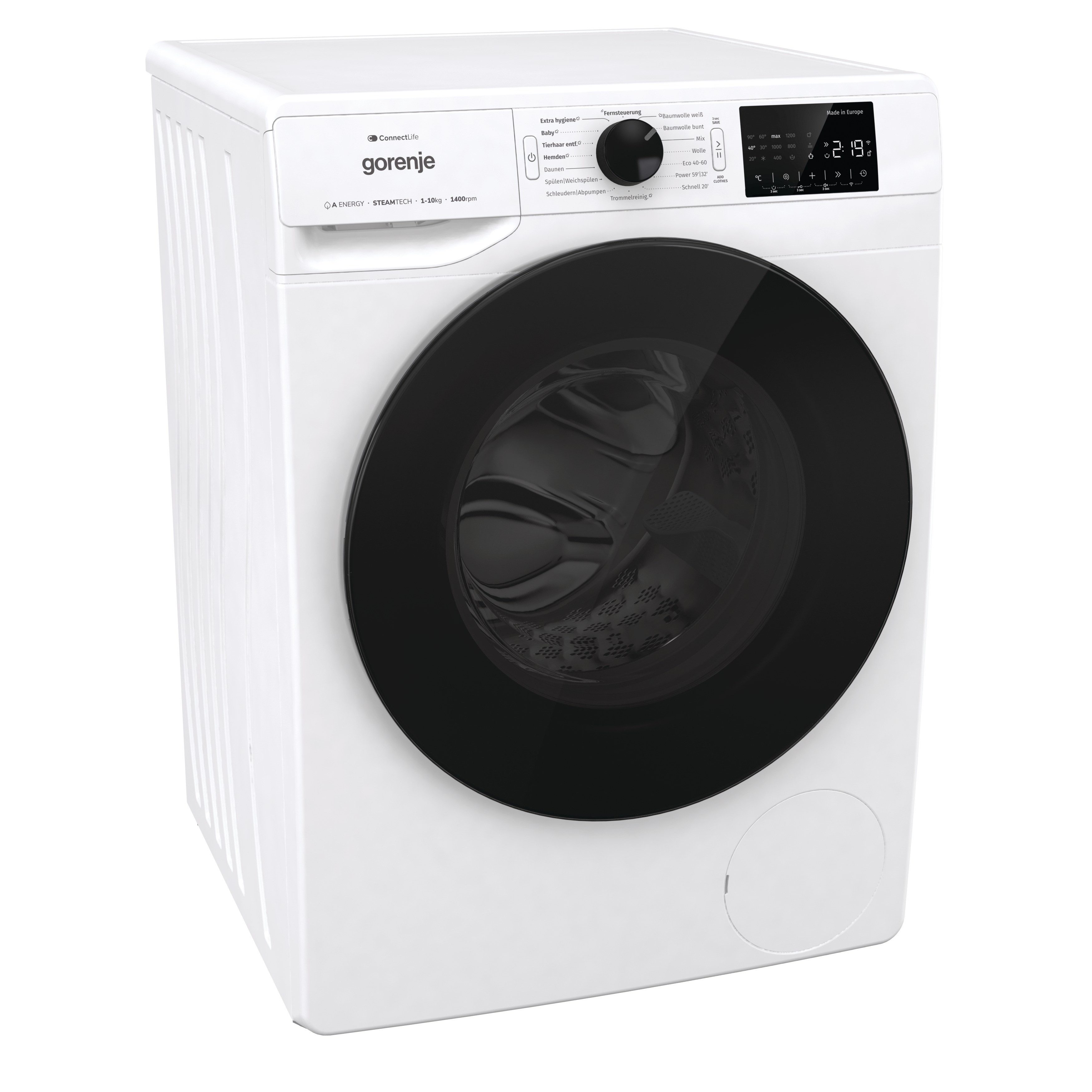 Die Waschmaschine WPNEI14A2TS von GORENJE glänzt durch eine hervorragende Ausstattung. Die Energieeffizienzklasse A (Skala: A bis G) zeichnet diese Waschmaschine als besonders stromsparendes Modell aus. Die Kapazitätsanforderungen von Familien ab 5 Personen stellen mit einem 10 kg Fassungsvermögen kein Problem dar. Der verbaute Invertermotor arbeitet nicht nur leise, sondern auch ganz und gar verschleißfrei. Folgende Besonderheit zeichnet die WPNEI14A2TS Waschmaschine aus: Nachlegefunktion. Die Waschmaschine verfügt über eine Dosieranzeige, mit der sich Waschmittel exakt dosieren lässt. Anhand der Startzeitvorwahl wird individuell eingestellt, wann die WPNEI14A2TS Waschmaschine mit dem Waschgang anfangen soll. Wurden einmal Wäschestücke vergessen, hält man mit der praktischen Nachlegefunktion das Gerät kurz an und holt das Beladen einfach nach. Die verbleibende Programmdauer wird auf der Restlaufanzeige dargestellt. So erkennt man immer, wie lange die Waschmaschine noch für den Waschgang braucht. Dank des eingebauten Wasserschutzsystems "Totaler AquaStop" beugt die WPNEI14A2TS Waschmaschine Wasserschäden vor. Mit Maßen von 60 cm x 85 cm x 61 cm (BxHxT) macht die Waschmaschine eine ausgezeichnete Figur.
