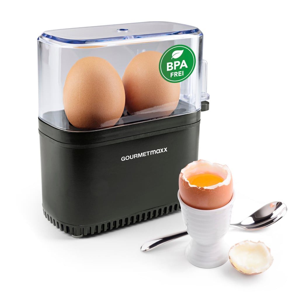 Was wäre ein ausgiebiges Frühstück ohne Brötchen, Obst, Müsli, Pfannkuchen – und natürlich perfekt gekochte Eier? Verzichte auf Herd und Kochtopf und hol dir den cleveren GOURMETmaxx Design-Eierkocher für 2 Frühstückseier. Denn so genießt du einfach überall dort köstliche Eier, wo du eine Steckdose findest. Schneller und leichter geht Eierkochen kaum!