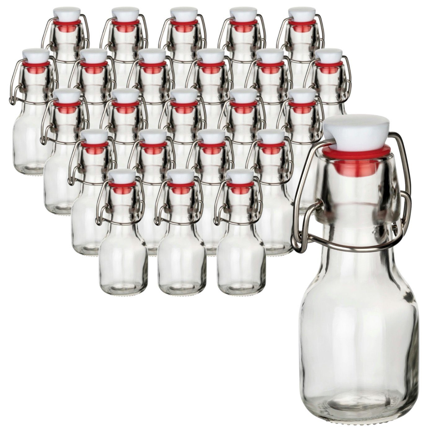 gouveo Glasflaschen 60 ml rund mit Bügelverschluss rot - Mini Bügelflasche 0,06 l zum Befüllen - Mini-Flasche für Likör, Schnaps, Shots, Hochzeit-Dekoration! Die Mini Glasflasche mit praktischem Bügelverschluss ist eine dekorative und vielseitig einsetzbare Flasche aus Glas. Die leere 60 ml Flasche ist perfekt zum Befüllen mit verschiedenen Flüssigkeiten und Dekorations-Accessoires. Dank des passenden Drahtbügelverschlusses lässt sich die kleine Flasche schnell, sicher und luftdicht verschließen. Das Aroma wird bewahrt. Der ideale Glasbehälter zur Aufbewahrung von Likör, Sirup, Öl oder Essig. Die Glasflasche ist auch als Geschenkidee oder zur Dekoration von Hochzeiten, Geburtstagen, Firmenfeiern oder Junggesellen-Abschiede geeignet. Hinweis: Die Glasfläschchen vor Gebrauch/Verwendung gründlich reinigen!