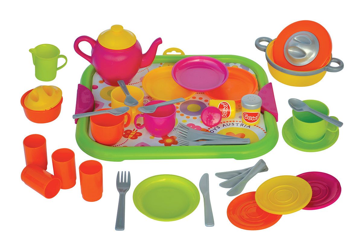 Ausstattung | Tablett Teekanne Becher Besteck Teller Topf Tassen Untersetzer |