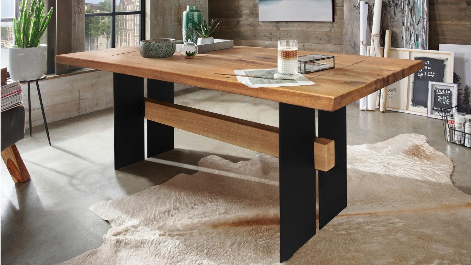 Esstisch GARCIA wurde aus hochwertigem Balkeneichenholz gefertigt und überzeugt neben seiner Materialqualität mit seiner stolzen Размер von 220x100 cm. Der Esszimmertisch weist eine harmonische Kombination aus natürlichem Holz und einem schwarzen Metallgestell auf. Zudem lässt sich der Tisch gut in Einrichtungen im Industrial Stil integrieren. Freuen Sie sich auf ein gemütliches Abendessen mit Ihrem neuen Eyecatcher.