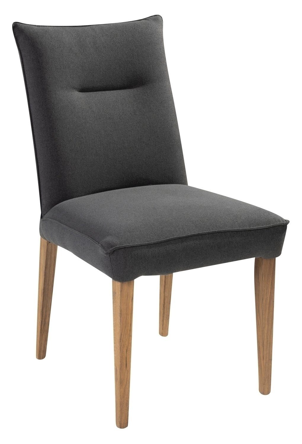 Der Polsterstuhl Dosso vereint Komfort und Eleganz in einem ansprechenden Design. Mit einer Breite von 47 cm, einer Höhe von 100 cm und einer Tiefe von 58 cm bietet er eine bequeme Sitzgelegenheit für verschiedene Räume. Dieser Stuhl verfügt über ein robustes Eichenholzgestell, das mit einer geölten Oberfläche versehen ist. Die dunkelgraue Polsterung aus strapazierfähigem Webstoff, die mit einer attraktiven Steppung verziert ist, verleiht dem Stuhl ein stilvolles Aussehen.