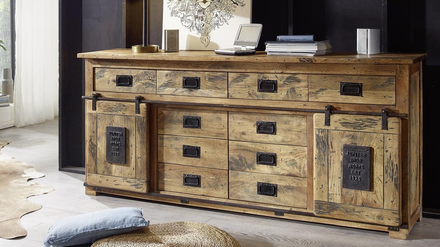 Der Wohnstil des Industrial-Chic nimmt Bezug auf industrielle Räume und alte Fabriken. Mit dem Sideboard GINGO erleben Sie rohe Materialästhetik, die durch gewollte Abnutzungsspuren erst seinen einzigartigen Charakter bekommt. Viel Stauraum ergibt sich durch 2 Schubkästen sowie je 2 Fächer hinter den beiden Rolltüren, die bei Bedarf auch Schubkästen verdecken und Dekorationselemente hervorbringen können.