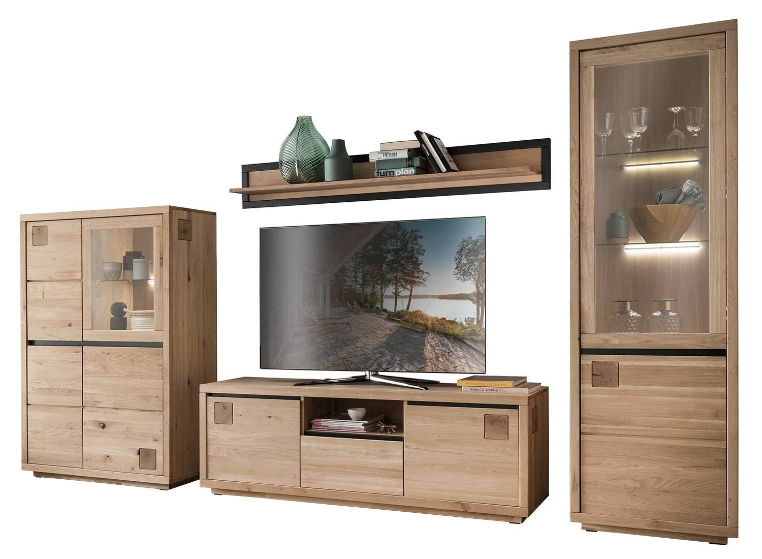 Lieferumfang | 4-teilige Wohnwand: 1 TV Lowboard, 1 Vitrine, 1 Highboard und 1 Wandboard. Die Beleuchtung ist nicht enthalten. |