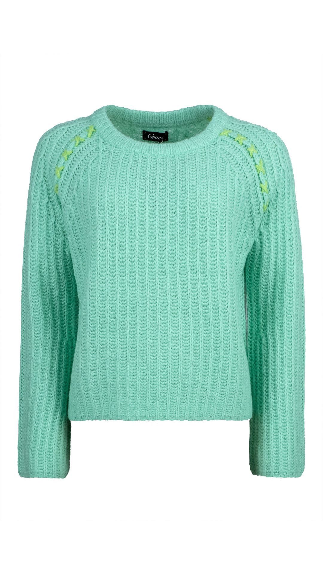 NEU Grace NEU . lässiger Perlfang-Raglan-Pullover, ohne Aufdruck, lange Ärmel, mit Rundhals-Ausschnitt. . Farbe: grün (780 mint) Material : 50% Wolle, 30% Nylon, 20% Alpaca