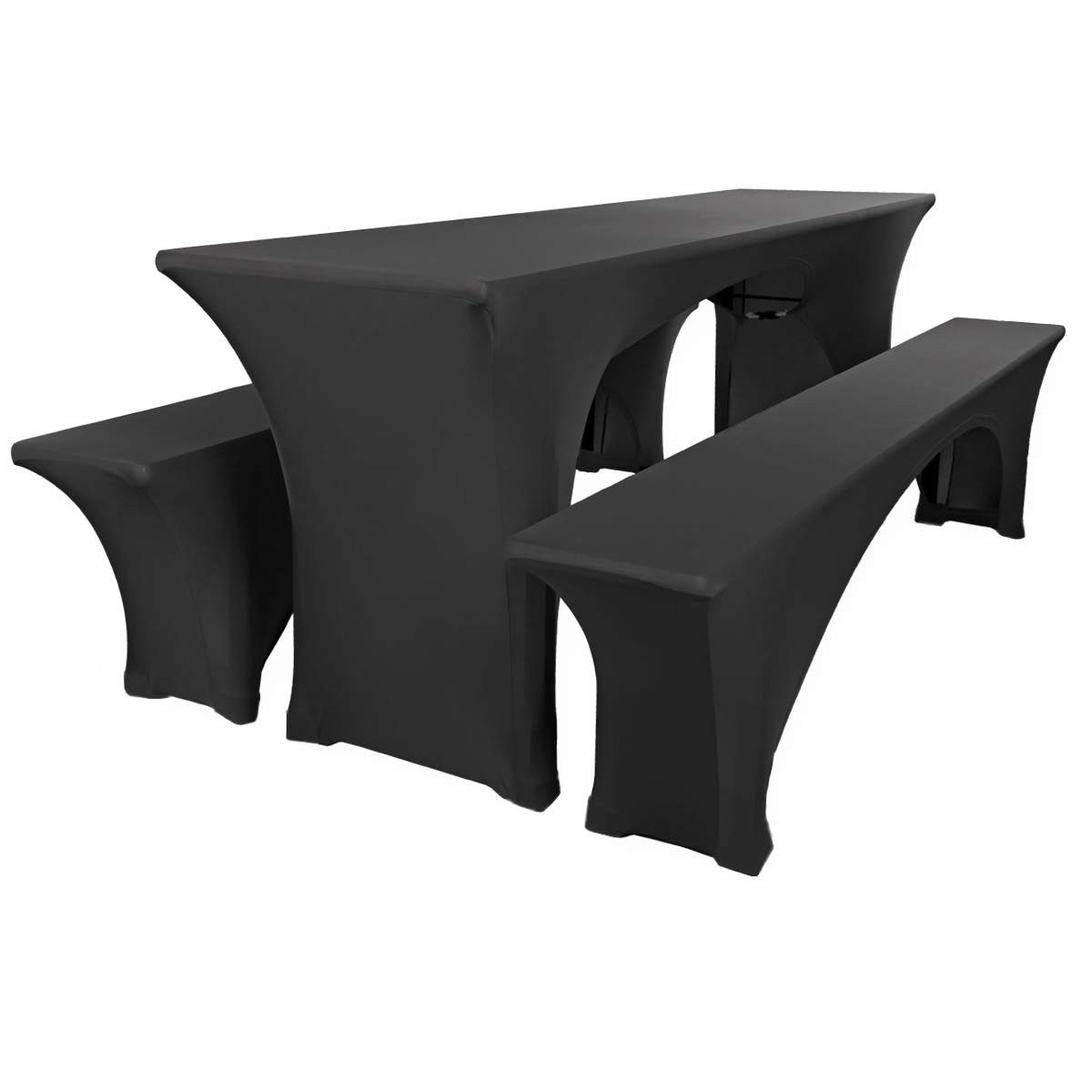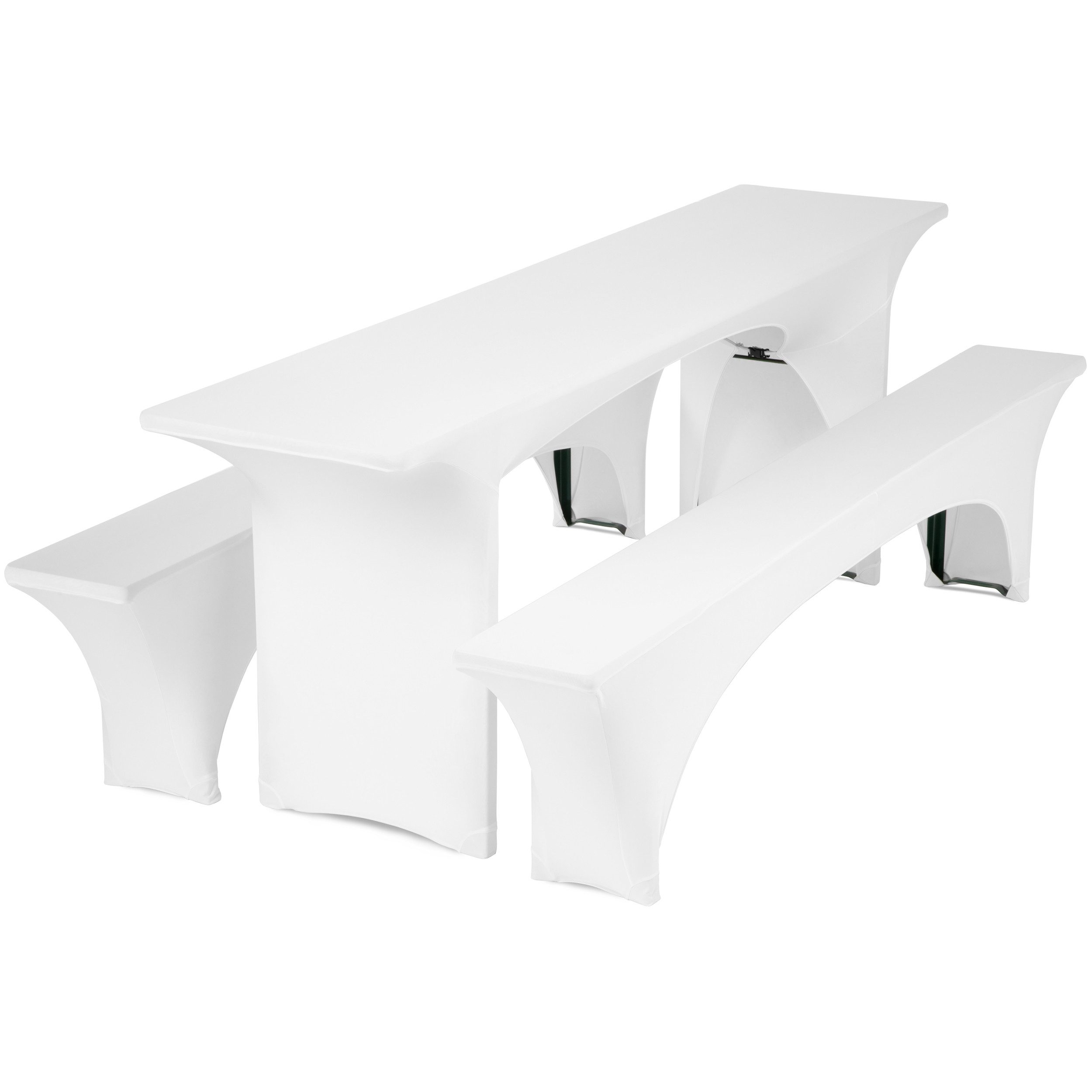 Vorteile: - Macht aus jedem einfachen Biertisch eine festliche Garnitur - Extra Spannbänder mit Steckverschluss (Klickverschluss) - Eingenähte Verstärkung für die Tischfüße und Bankfüße - Ideal auch für geschäftliche Empfänge oder Feste - Doppelt versäumter Rand ringsum - Aus dehnbarem Stretchstoff - Waschbar