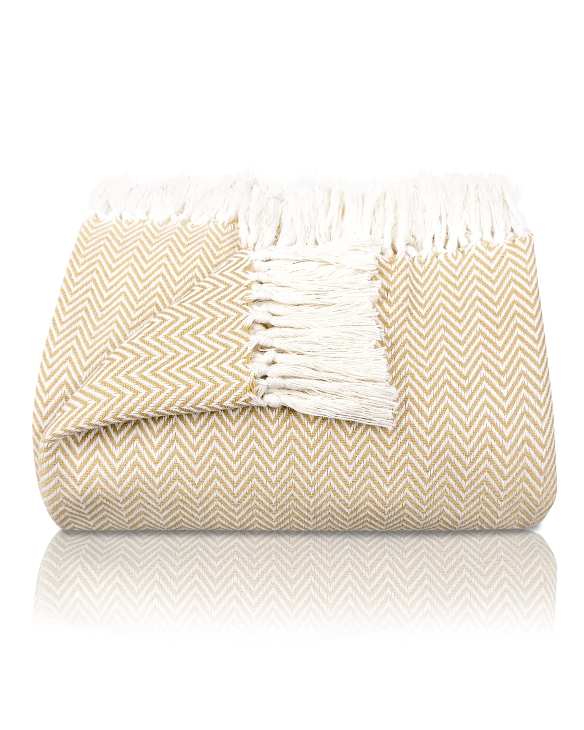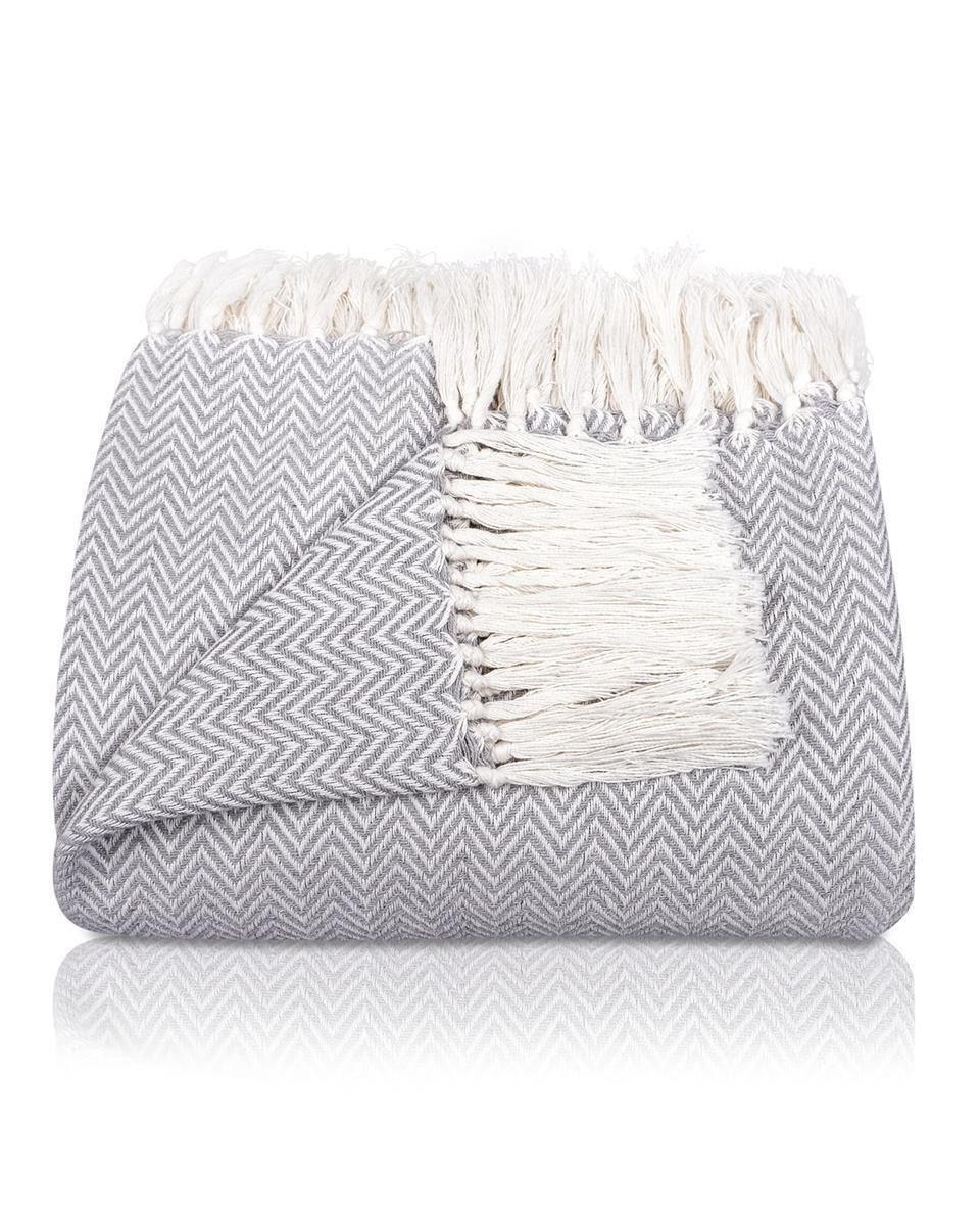 Die Decke mit ihrem stilvollen Fischgrätenmuster und weichen Fransen ist nicht nur ein optisches Highlight, sondern sorgt dank der atmungsaktiven Baumwolle auch für ein besonders angenehmes Hautgefühl. Vielseitig einsetzbar, bietet sie sich als dekorativer Überwurf für Bett und Sofa an oder als Kuscheldecke für entspannte Stunden.
