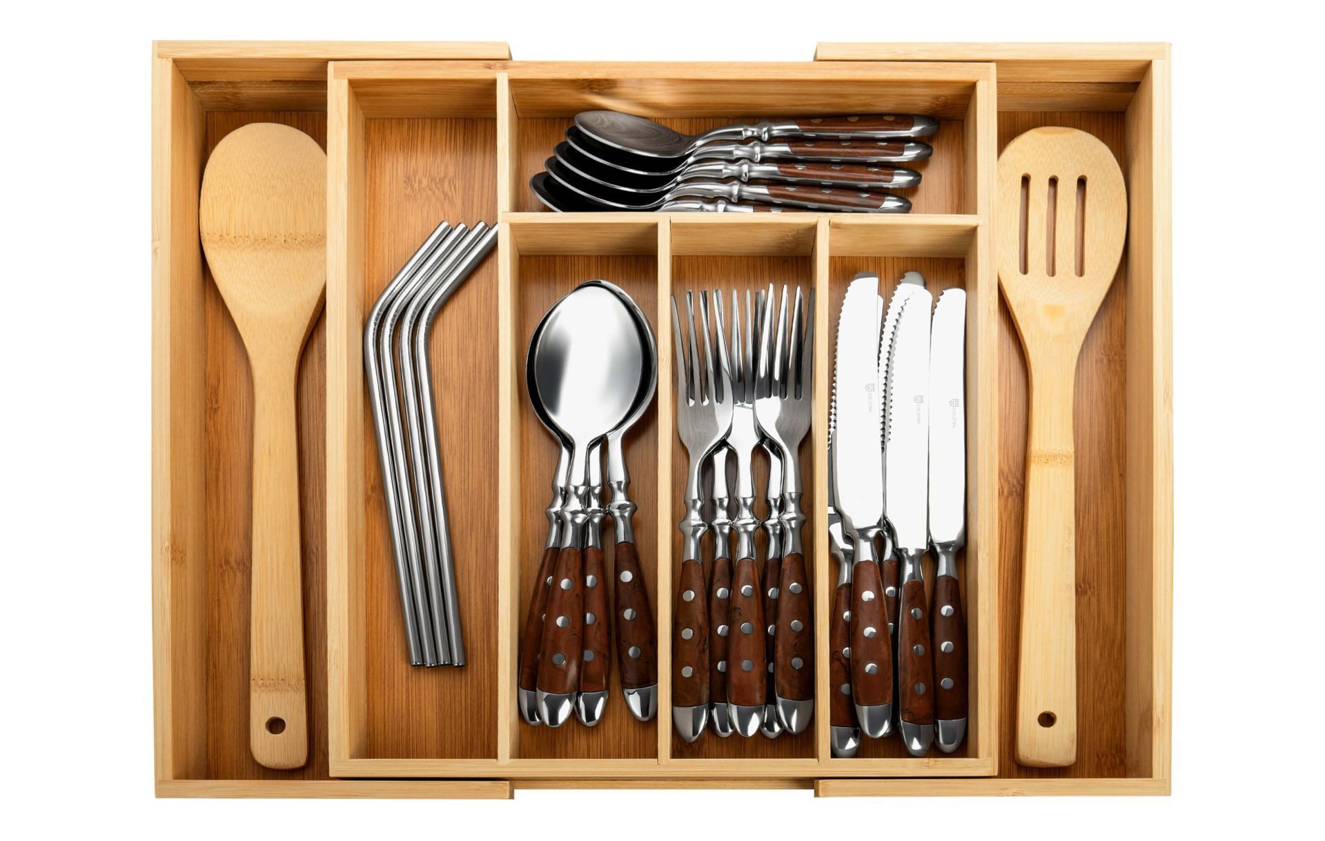 Dieser praktische Besteckkasten ist variabel einstellbar und kann von ca. 28,5 cm Breite auf ca. 40,5 cm Breite ausgezogen werden. Dadurch werden zwei weitere Fächer für die Aufbewahrung geschaffen.