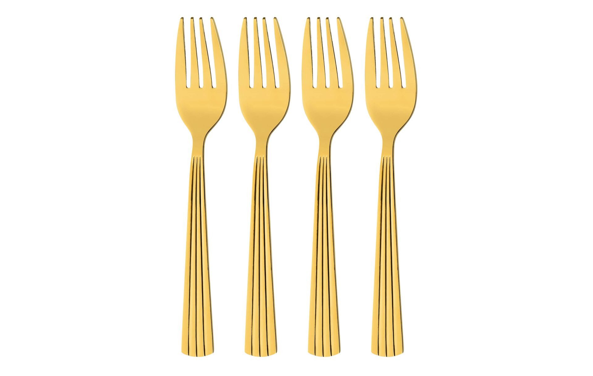 Die GRÄWE Kuchengabeln der Serie Athen entführen Sie in eine Welt des Genusses für köstliche Desserts und verführerische Kuchen – diesmal mit anmutigen Gold-Akzenten. Dieses exklusive 4-teilige Set, gefertigt aus hochwertigem Edelstahl 18/0, besticht durch sein schlichtes Design und dezente Linienprägungen als stilvolles Dekor auf den Griffen.
