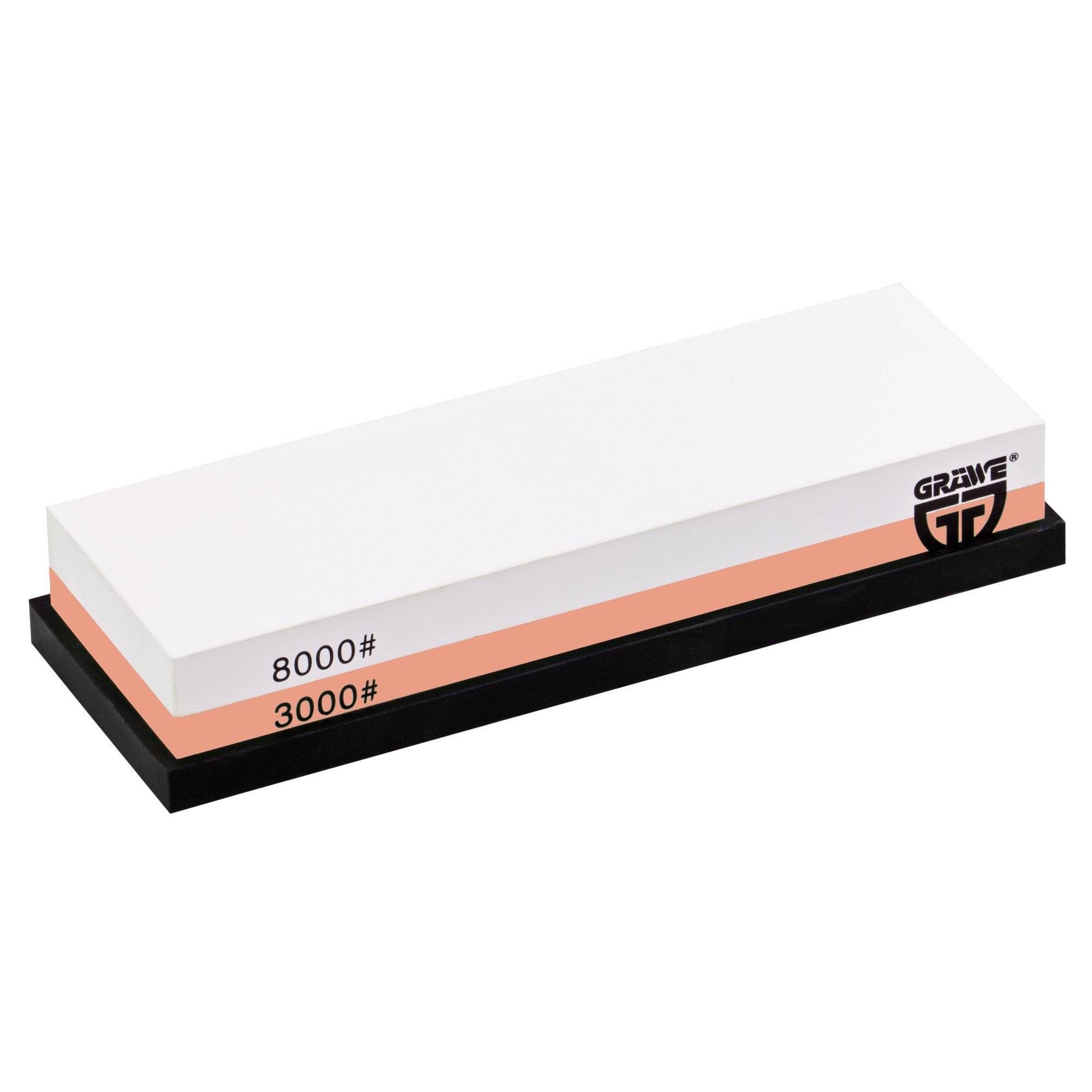 Wetzstein aus Korund mit zwei Körnungen (3000 und 8000), für den Feinschliff und abschließenden Polierschliff von Messerklingen. Mit dem 3000er Feinschliff wird die Klinge für den abschließenden Polierschliff vorbereitet. Verleiht Küchenmessern und Haushaltsmessern durch leichten Abrieb wieder neue Schärfe.