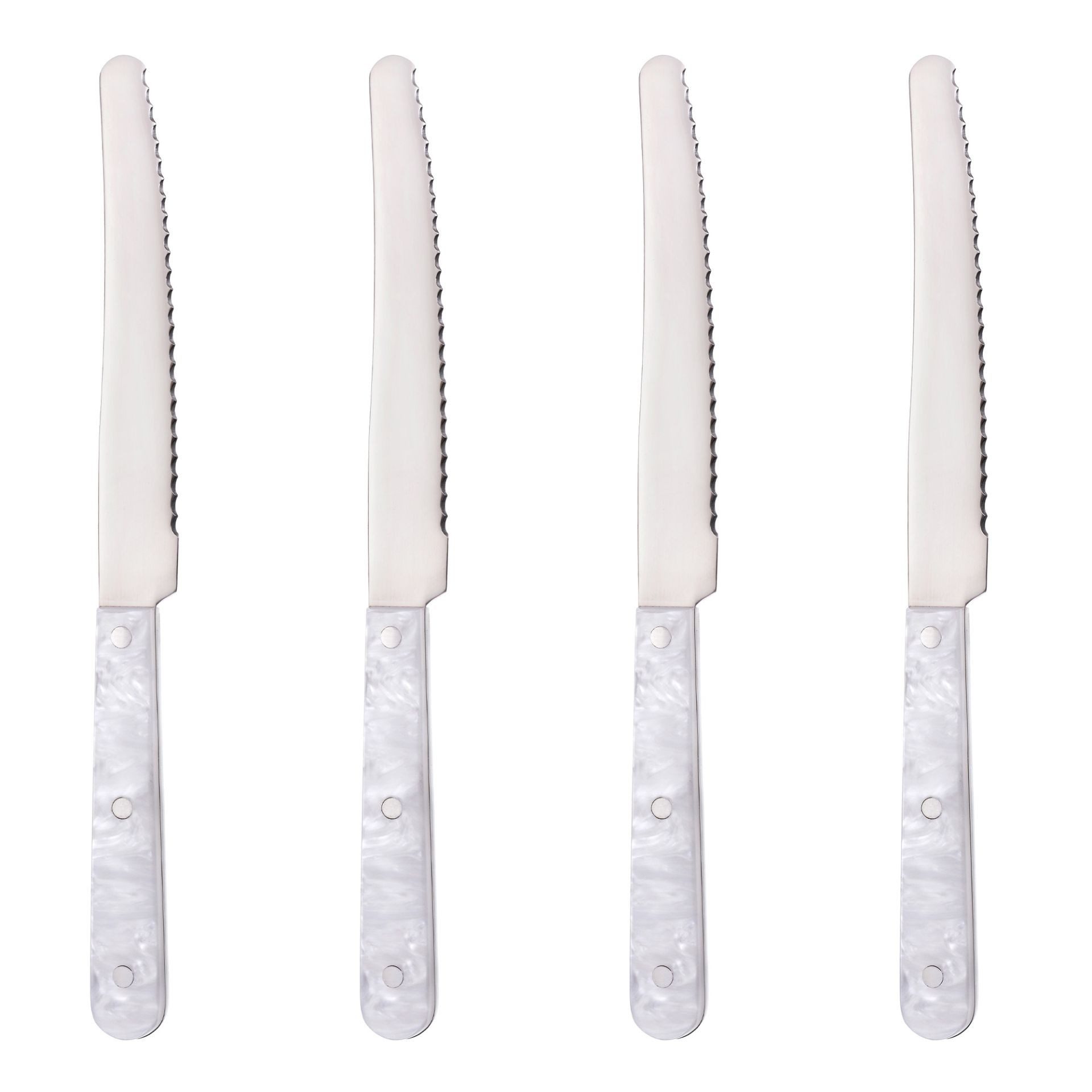 Das stabile Besteck mit hochwertigem Kunststoffgriff in schöner Perlmuttoptik eignet sich für jeden Anlass, ist zeitlos und liegt aufgrund des breiten Griffs gut in der Hand. Die gehärtete Klinge aus speziellem Klingenstahl ist durchgehend, dreifach genietet und hat einen Wellenschliff. Die Serie PERLMUTT ist spülmaschinengeeignet.
