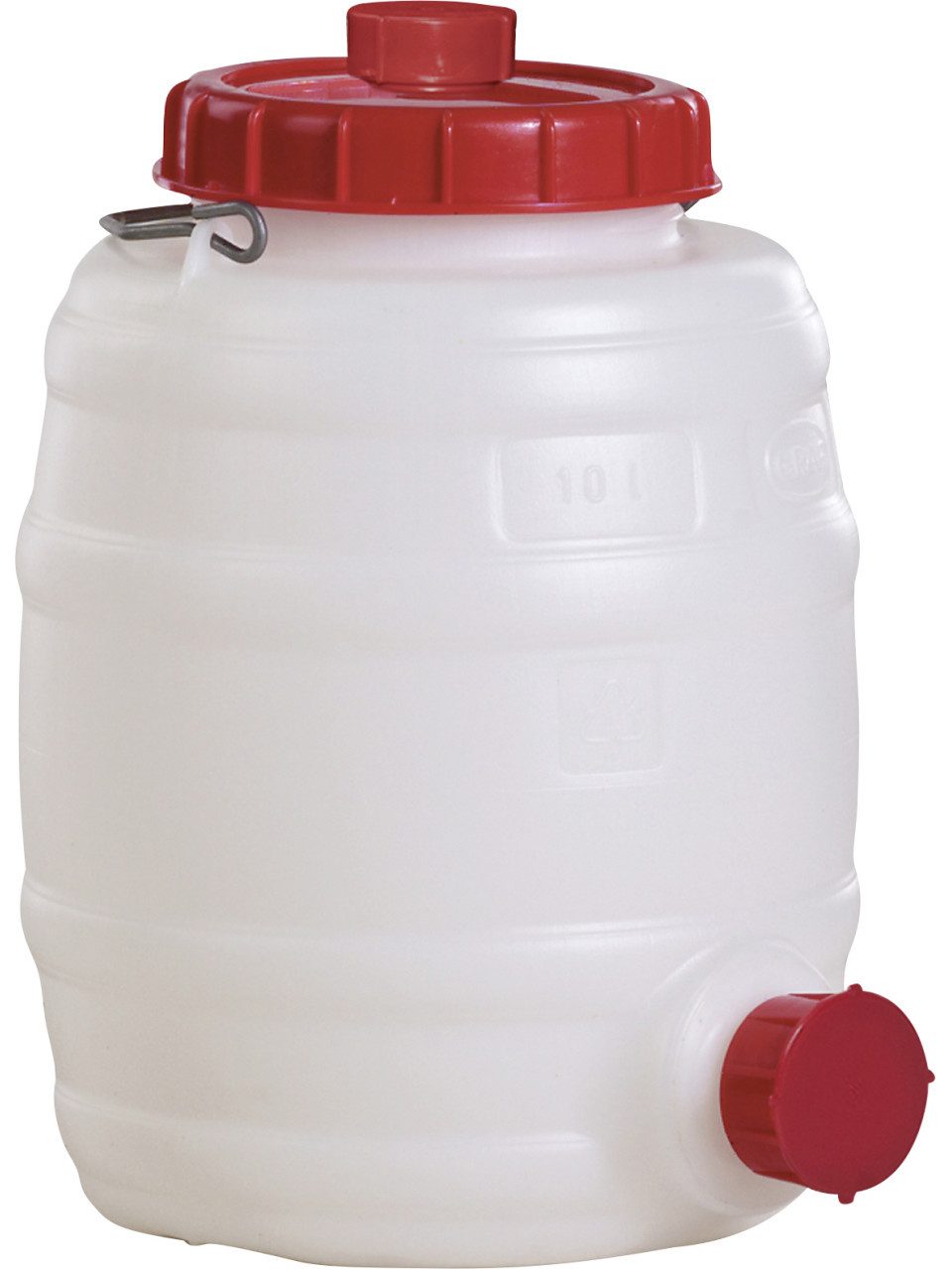 Produktdetails: Material: lebensmittelechtes Polyethylen | Farbe: rot / weiß | Form: rund | Volumen: 30 L | Höhe: 460 mm | Ø 330 mm | Gewicht: 1,6 kg | lebensmittelecht | 2 Tragegriffe (Tragfähigkeit je Griff 30 kg) | 2-teiliger Schraubdeckel mit Dichtung | Auslaufstutzen Ø 34 mm | 2 Verschlusskappen mit Dichtung |