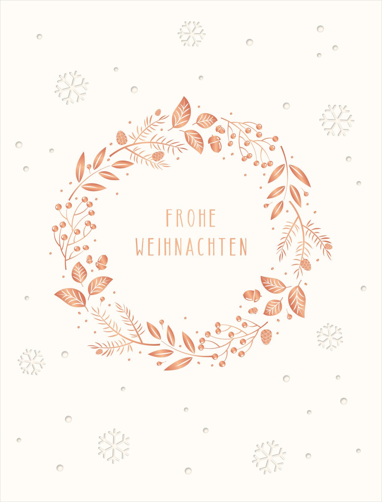 Weihnachtskarte mit einem Blütenkranz und Text Frohe Weihnachten