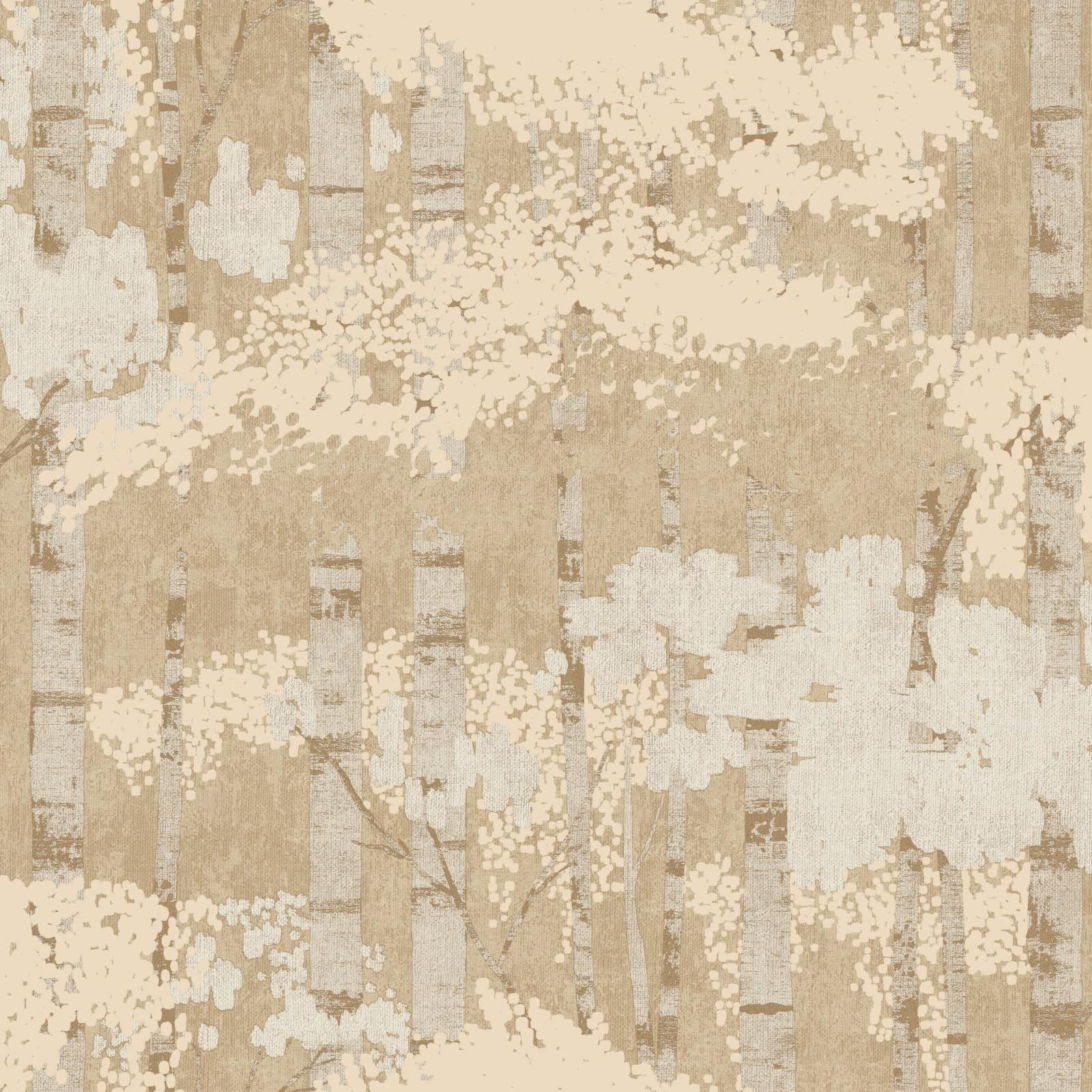 Diese Vliestapete aus der Kollektion Ciara von Grandeco verleiht jedem Raum einen modernen Touch. Dieses beeindruckende Tapetenmuster wertet im Handumdrehen dein Zuhause auf. Die Tapete A62702 zeigt ein abstraktes Wald-Motiv in Beige- und Cremetönen mit Metallic-Effekt in Gold. Entdecke jetzt auch die Впередen Tapeten dieser Kollektion bei uns im Shop!