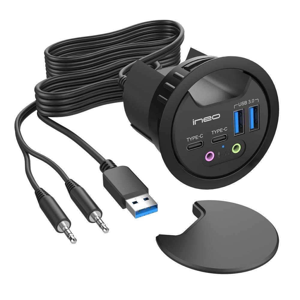 Dieser 4-Ports USB-HUB ermöglicht den einfachen Zugriff auf USB- und Audio-Anschlüsse direkt auf Deinem Schreibtisch. Der „Tisch-Hub“ lässt sich einfach in vorhandene Kabelduchführungen mit 60 oder 80mm Durchmesser in Deinen Schreibtisch werkzeuglos montieren. Mit den 150cm langen Anschlusskabeln kannst Du unseren „Tisch-Hub“ ganz einfach mit Deinem PC verbinden. An den USB-Ports, 2x USB-C & 2x USB-A (USB 3.0) werden die Daten mit bis zu 5 Gbit/s übertragen. Neben den 3,5mm Audio- und Mikron Anschlüssen, schützt die mitgelieferte Staubschutzabdeckung den „Tisch-Hub“ bei Nichtbenutzung vor dem Eindringen von Staub.