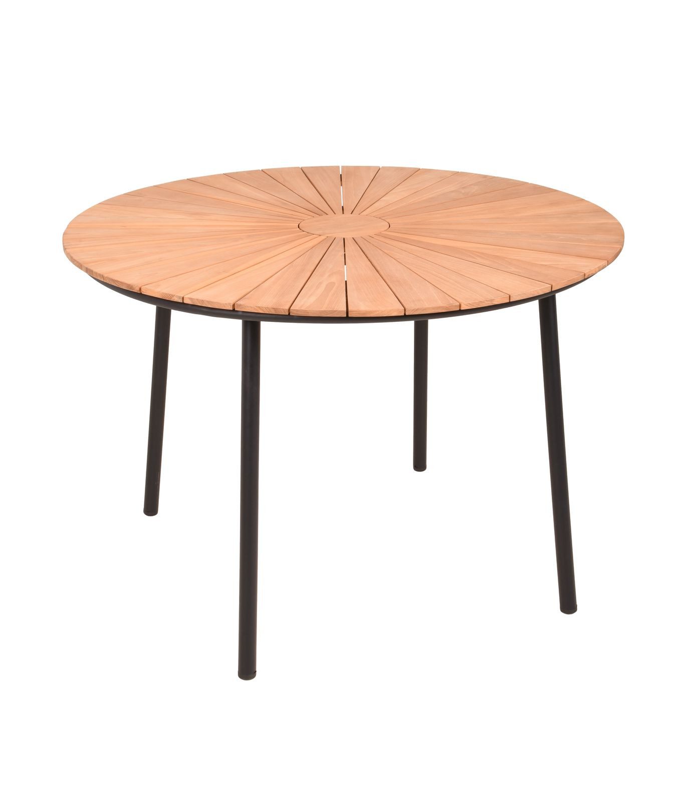 Dank seiner runden Form mit einem Durchmesser von 110 cm bietet der Tisch Platz für mehrere Personen und sorgt für eine kommunikative Atmosphäre bei gemeinsamen Mahlzeiten oder geselligen Runden. Die 36 Teakholzlatten mit glatter Oberfläche sind nicht nur optisch ansprechend, sondern auch besonders pflegeleicht und wetterbeständig.