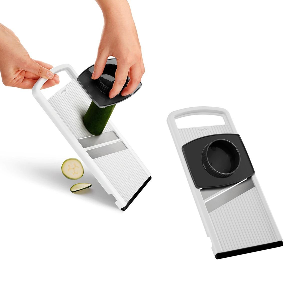 Dank diesem Gemüsehobel mit Restehalter und 2 Edelstahlklingen schneiden Sie Ihr Gemüse