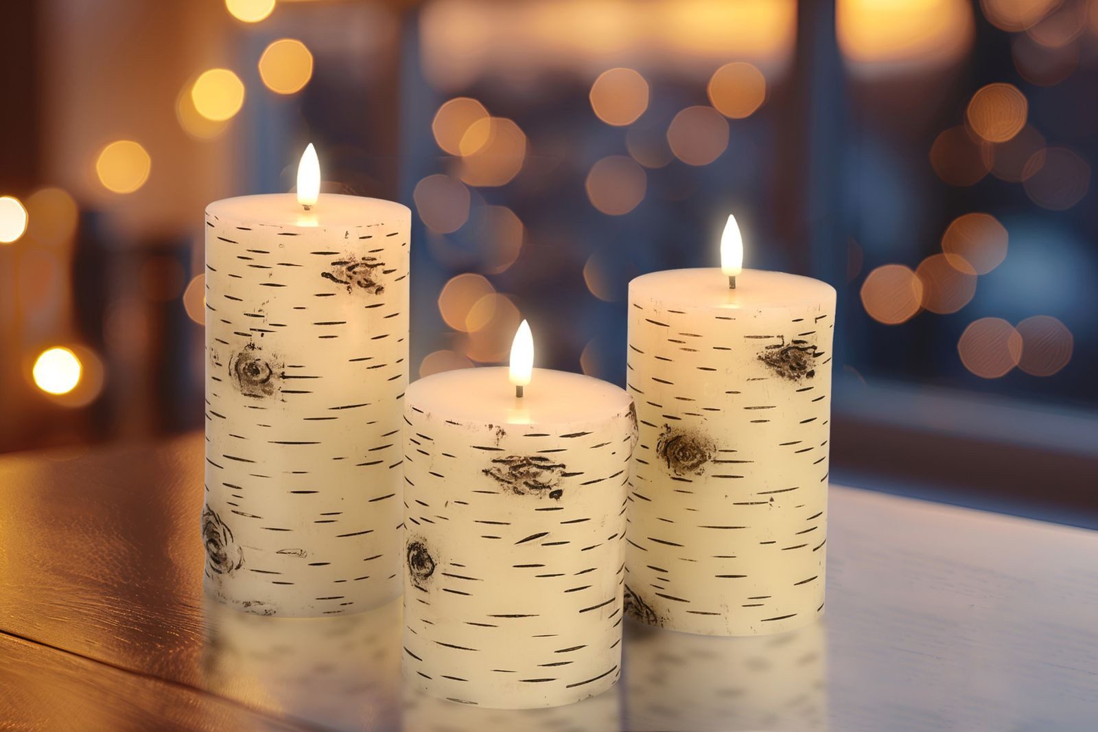 LED-Wachskerze 3er-Set Birkenholzoptik mit Timer und Flamme
