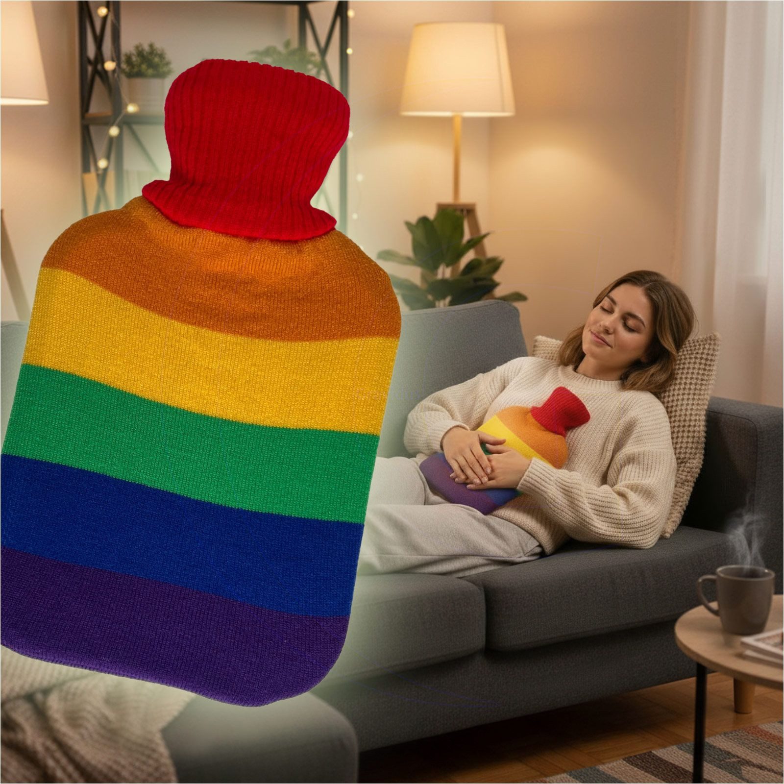 Wärmflasche mit Regenbogenbezug, 2L, weich & bunt, ca. 34x18 cm