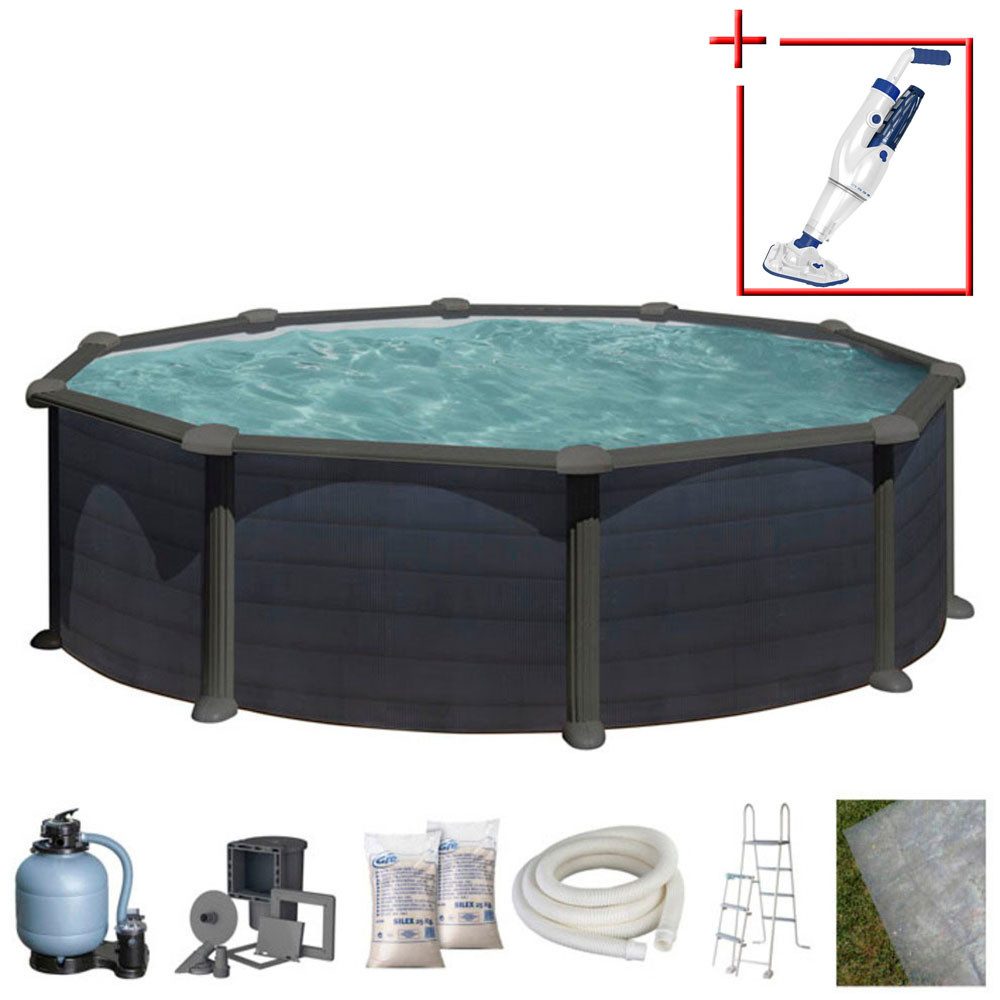 Die vorgeformte und farblich passende, je nach Modell, graue oder blaue PVC-Innenhülle ist dank ihrer Anti-UV-Behandlung und der hohen Materialstärke äußerst langlebig und legt sich von innen optimal an die Poolstruktur. Eine Sicherheitsleiter sorgt zugleich für einen sicheren und angenehmen Einstieg in den Pool und verhindert bei Nichtverwendung des Pools unerwünschten Zutritt. Vervollständigt wird der umfangreiche Lieferumfang, je nach Modell, durch eine passende Kartuschen- oder Sandfilteranlage inklusive des benötigten Filtermediums, eine kraftvolle Pumpe, ein Skimmerset, ein Bodenschutzvlies und falls erforderlich ein zusätzliches Befestigungssystem oder außenliegende Seitenstützen.