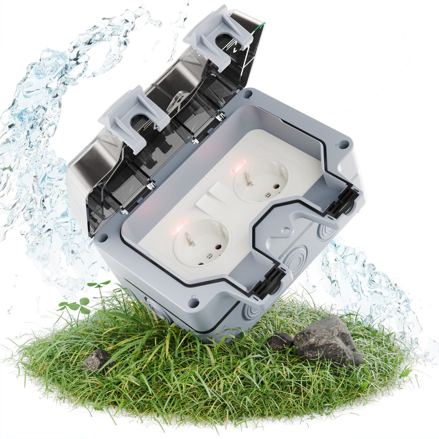 • 2 SCHALTER - Die Schalter der IP66 Steckdose lassen sich separat ein- & ausschalten - Kontrollleuchte zeigt ob die Steckdose für den Außenbereich eingeschalten ist