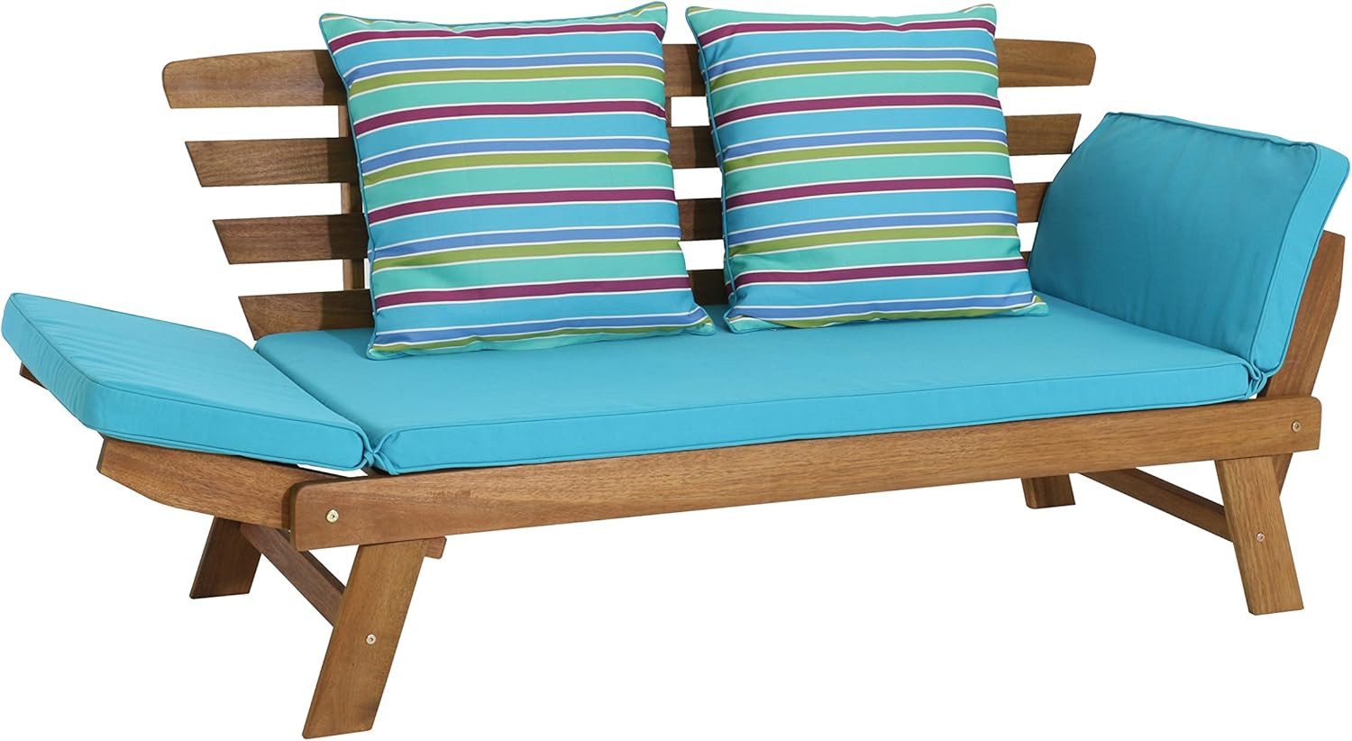 Funktionelle Gartenbank mit einfach verstellbaren Armlehnen, wahlweise flach oder aufrecht einstellbar – flexibel als Sitzbank, Sonnenliege oder Gartensofa nutzbar Moderne Terrassenliege aus Akazienholz FSC 100% mit Auflagen und Kissen aus 100 % Polyester – optimal für den Einsatz im In- oder Outdoor-Bereich Maße (BxHxT): ca. 146-198 x 78 x 68 cm; Sitzmaße (inkl. Auflage): ca. 130 x 60 x 40 cm; Kissenstärke: ca. 5 cm; Gewicht: ca. 20 kg; max. Belastbarkeit: 2 x 110 kg Braune Balkonbank mit Platz für bis zu zwei Personen – mit leicht schräger Rückenlehne für mehr Sitzkomfort Lieferumfang: 1x Multifunktionsliege Borkum inklusive türkiser Auflage und zwei mehrfarbig gestreiften Dekokissen