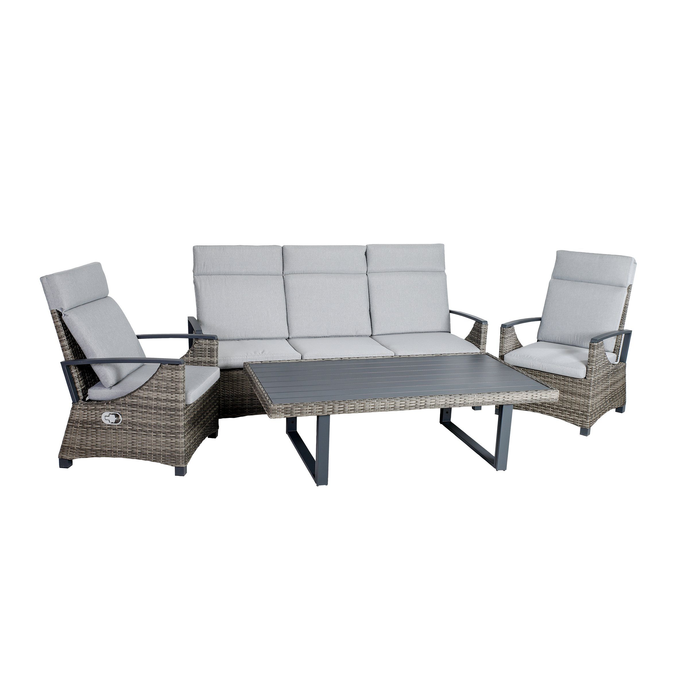 Funktionelle Möbel-Garnitur mit Extra-Komfort. Das elegante Lounge-Set Antigua besteht aus zwei Sesseln, einem Sofa sowie einem Tisch und begeistert mit zahlreichen Vorzügen. Besonders gemütlich wird die Kombination durch die verstellbaren Rückenlehnen an den Sesseln und äußeren Sofaplätzen. Dank Gasdruckfedern ist die Neigung stufenlos wählbar. Auch eine Liegeposition ist einstellbar. Für hohe Flexibilität sorgen die klappbaren Tischbeine, sodass zwischen zwei Höhen variiert werden kann. Das Set ist aus einem grauen Aluminiumgestell gefertigt, welches für Langlebigkeit und Leichtigkeit sorgt. Hinzu kommt eine Bespannung mit braunem Polyethylengeflecht – strapazierfähig, schmutz- und wasserabweisend, gut beständig gegen Witterungseinflüsse und UV-Strahlung. Die ca. 8 cm starken Kissen in grauer Farbgebung sind aus 100 % Polyester und bilden einen schönen Kontrast zu dem Kunststoffgeflecht in warmem Farbton. Blickfang sind die Aluminium-Latten der Tischplatte – modernes Design für outdoor und indoor. Die Sessel der schicken Lounge messen jeweils ca. 65 x 75 x 102 cm, das Sofa kommt auf ca. 195 x 86 x 109 cm. Die Maße des Tisches liegen bei ca. 160 x 90 x 68,5 cm. Auf den Sitzgelegenheiten können es sich bis zu fünf Personen bequem machen – sie sind pro Platz bis maximal 110 kg belastbar. Beste Voraussetzungen für gesellige Runden.
