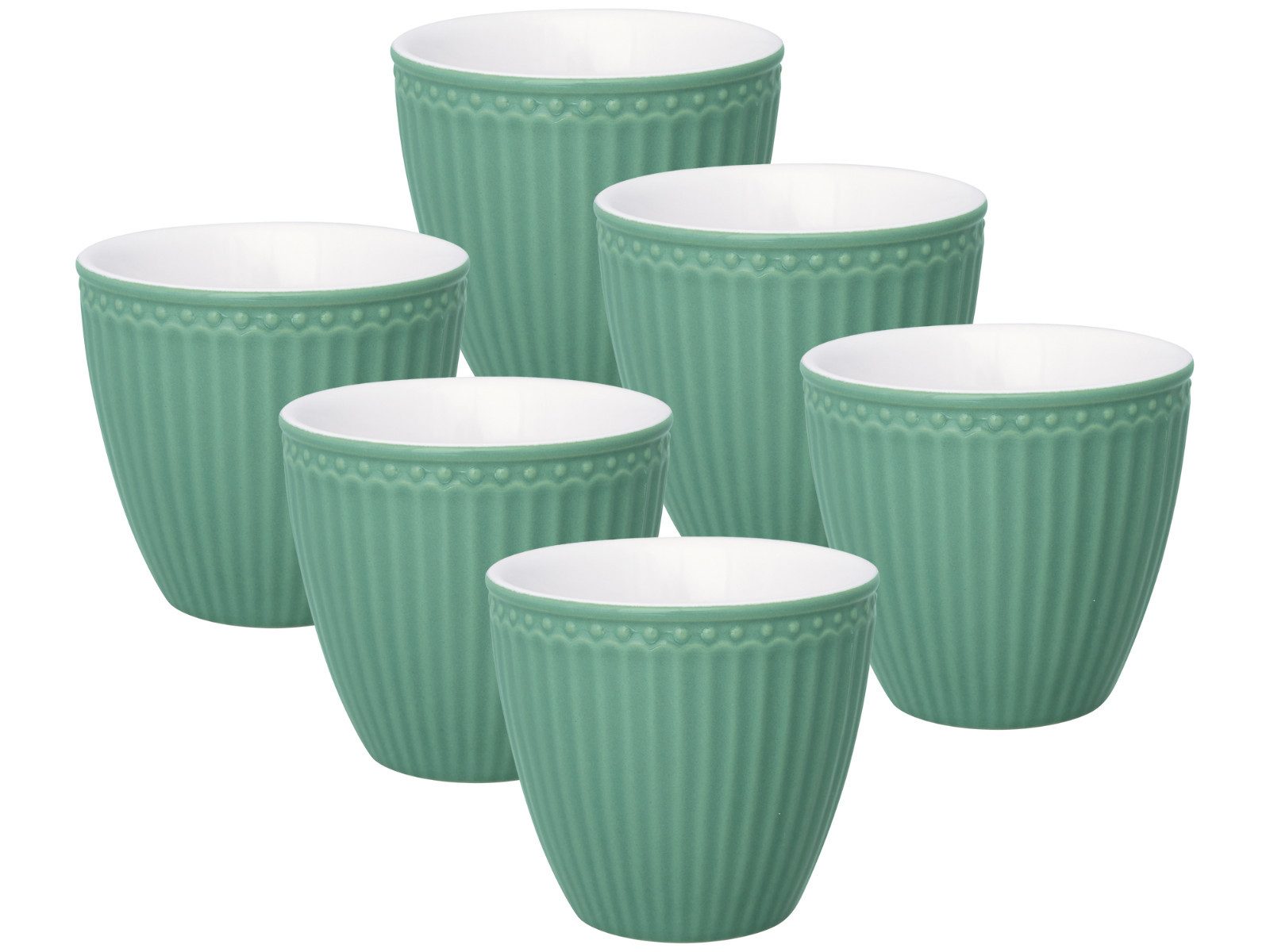 Das 6teilige Set der Greengate Alice Latte Cups in Dusty Green vereint skandinavische Klarheit mit einem frischen Farbakzent. Mit einem Fassungsvermögen von 0,25 l eignen sich die Becher ideal für Latte Macchiato, Cappuccino, Tee oder heiße Schokolade – perfekt für stilvolle Genussmomente im Alltag.