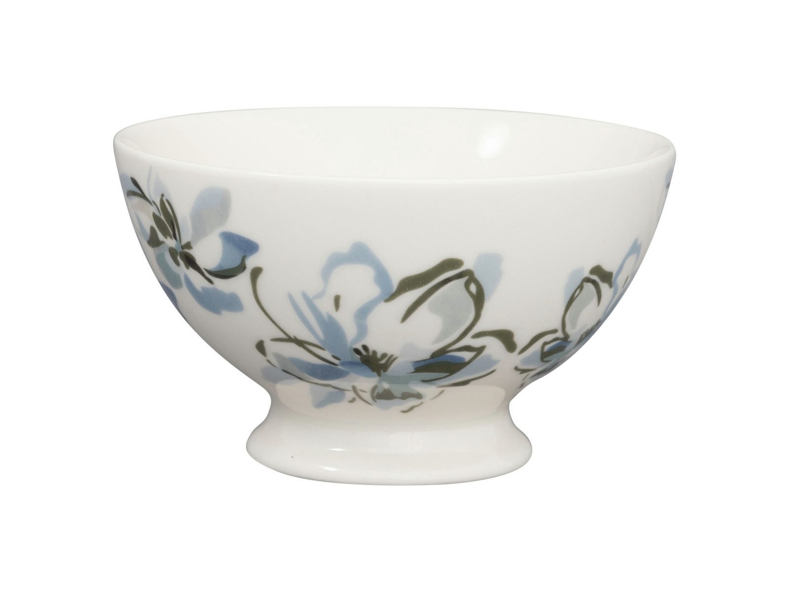 Die klare weiße Farbe der Schale bildet einen eleganten Hintergrund für das dezente blau-graue Blumenmuster, das dem Design eine subtile, aber dennoch auffällige Note verleiht. Dieses florale Dekor ist geschmackvoll und zeitlos, und passt sich mühelos verschiedenen Tischdekorationen an.