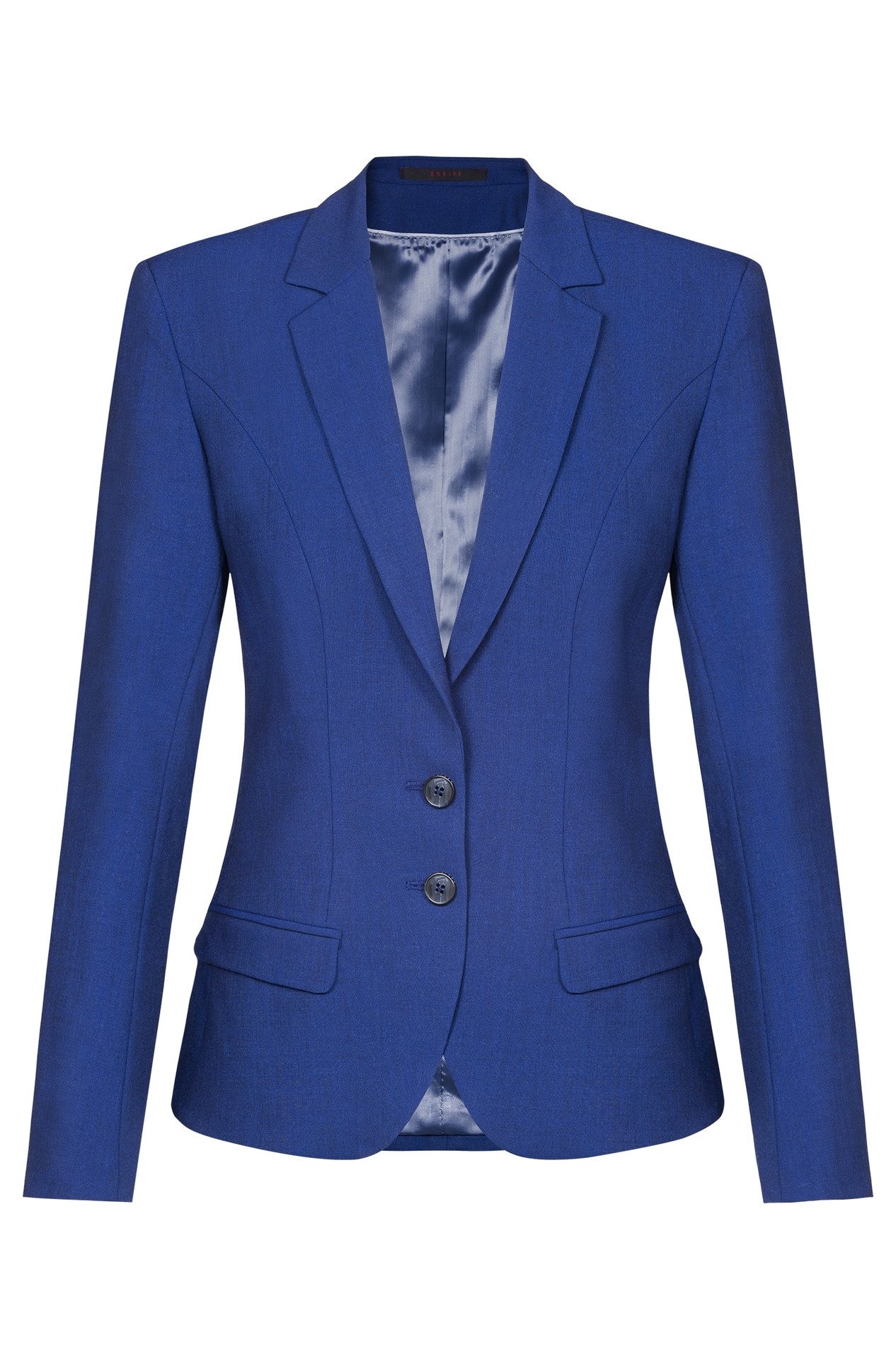 Schmal geschnittener Damen-Blazer. Hier trifft ein professioneller Business-Look auf Funktionalität: Der 2-Knopf-Blazer aus der GREIFF Premium Kollektion ist wasser- und schmutzabweisend. Für ein Plus an Bewegungsfreiheit sorgt die Bi-Stretch-Qualität. Seitenschlitze und Pattentaschen setzen außen Akzente, während in der Innentasche mit Reißverschluss Platz für Kleinigkeiten ist. Aus besonders hochwertigem Mischgewebe mit 60% Schurwolle – für ein angenehmes Tragegefühl.
