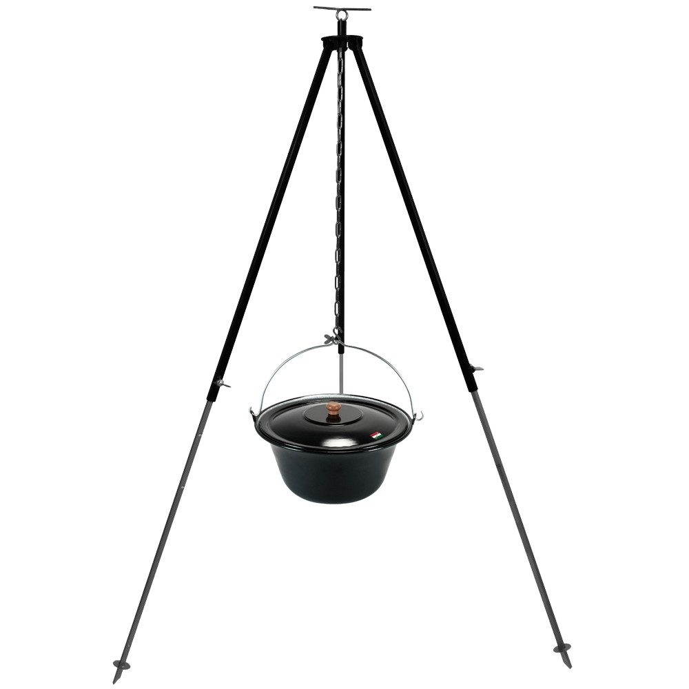 Zusätzlich zum Gulaschkessel mit dem Deckel wird auch ein ungarisches Dreibein geliefert. Dieses Dreibein ist ein Teleskopgestell und kann individuell in der Höhe angepasst werden. Zusätzlich hat das ungarische Dreibein von Grillplanet® eine Kettenhöhenverstellung mit Kettenzug. Hier kann man ebenfalls die Höhe über dem Feuer anpassen. Das Teleskopgestell kann auf eine Höhe von 1 m bis 1,8 m eingestellt werden.