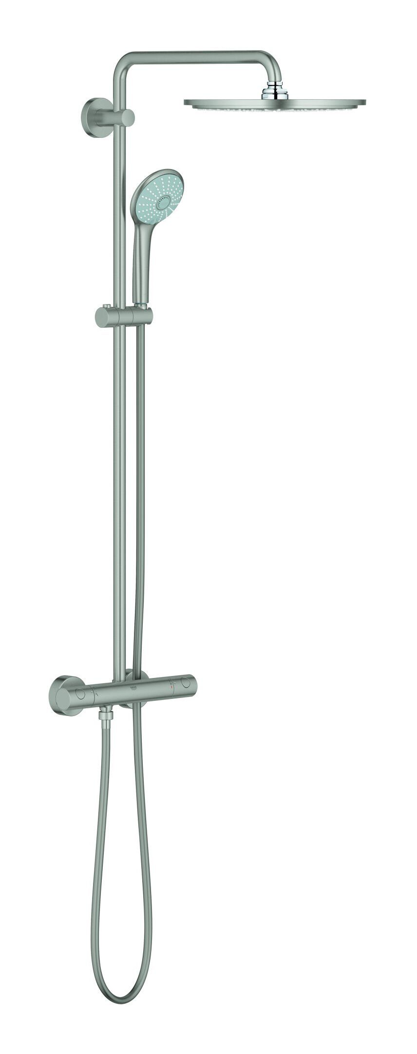Lieferumfang | Horizontal schwenkbarer 450 mm Duscharm Aufputz-Thermostat mit Aquadimmer Funktion Kopfbrause Rainshower Mono 310 (26 562) mit 1 Strahlart (GROHE PureRain) mit Kugelgelenk (Drehwinkel ± 15°) Handbrause Euphoria 110 Massage (27 239) mit 3 Strahlarten (Rain Massage SmartRain) in der Höhe verstellbar mittels Gleitelement Brauseschlauch Silverflex 1.750 mm (28 388) |