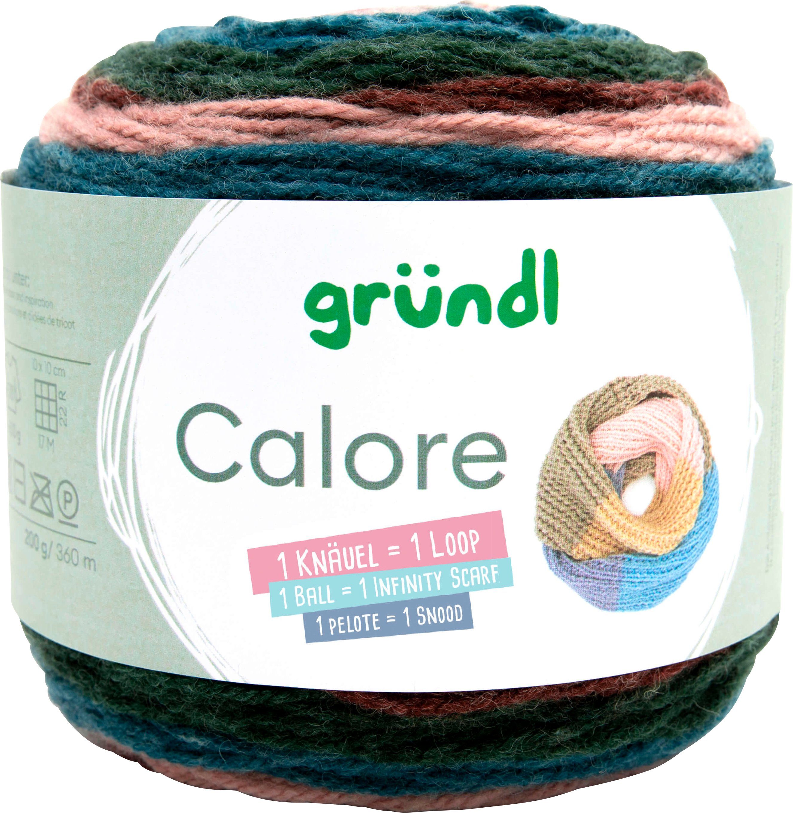 Gründl Calore, Lauflänge ca. 360 und Gewicht ca. 200 g aus 80 % Polyacryl und 20 % Wolle. Mit breitem Farbverlauf in harmonischen Farbtönen. Zum Verstricken eignet sich eine Nadelstärke von 5,0 – 6,0. Mit nur einem Knäuel kann ein Loop gestrickt werden. Hierzu befindet sich die Anleitung auf der Innenseite der Banderole. Die Wolle eignet sich auch für viele weitere winterliche Strickprojekte wie Pullover, Ponchos, Handschuhe, Mützen und Schals.