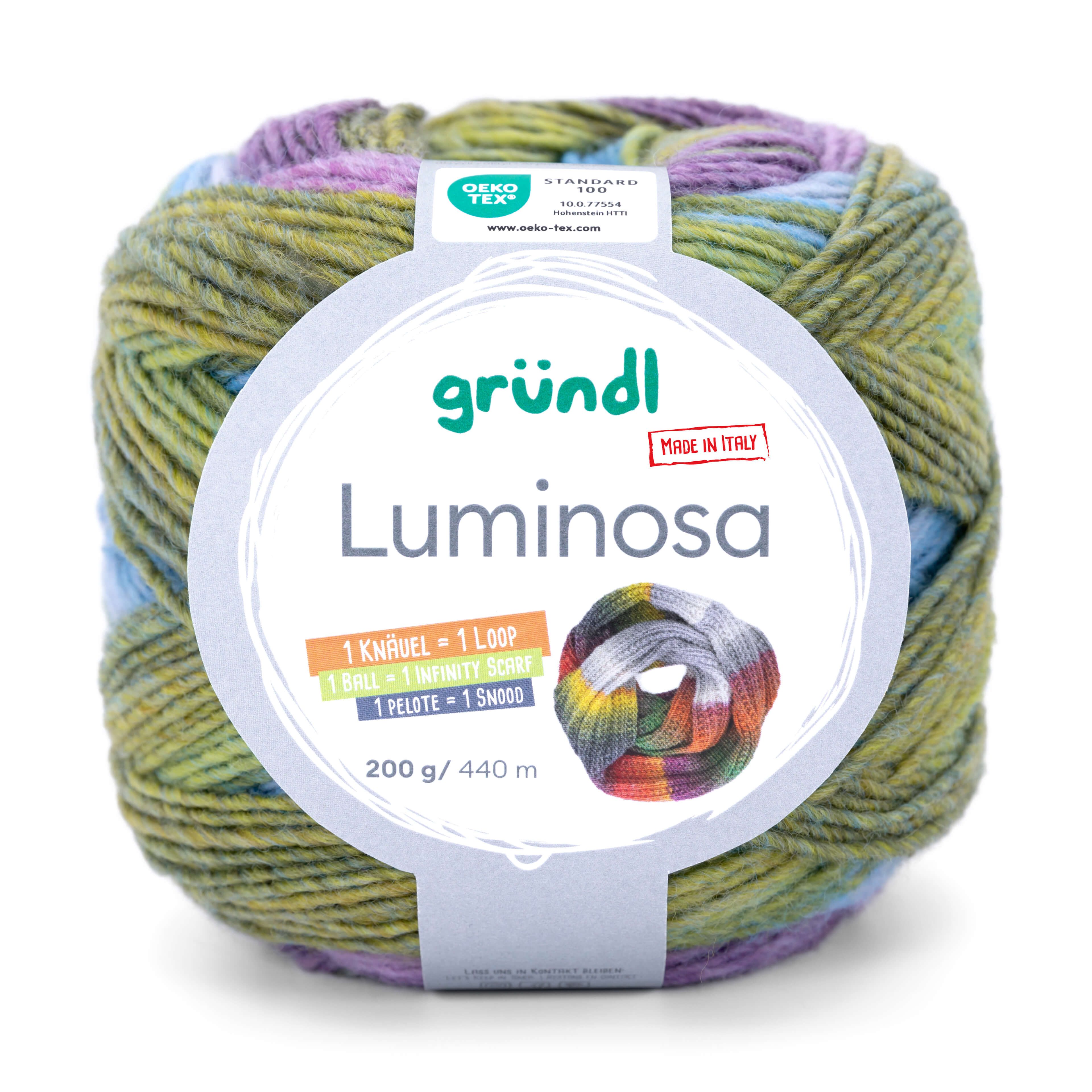 Was du über Gründl Luminosa wissen solltest Hast du schon einmal ein Garn in der Hand gehabt, das dich sofort verzaubert? Genau so wird es dir mit unserer Luminosa ergehen. Dieses kuschelweiche, voluminöse Dochtgarn ist leicht gedreht und in einem großzügigen 200 g Großknäuel erhältlich – perfekt für lange Farbverläufe, die deinem Strick- oder Häkelprojekt einen einzigartigen Look verleihen. Luminosa ist ein Wollmischgarn mit traumhaften Farbverläufen, das leicht und schnell zu stricken ist. Dank des geringen Materialverbrauchs kannst du mit einem einzigen Knäuel (200 g) bereits einen wunderschönen Loop zaubern. Und das Beste: Eine Anleitung dafür findest du direkt in der Banderole. Selbst ohne aufwändige Muster sind die Modelle, die du mit Luminosa kreierst, echte Hingucker. Lass dich von den sechs verschiedenen, wunderbaren Farbkombinationen mit Multi-Farbverlauf verzaubern. Was du aus Gründl Luminosa machen kannst Всеs einmal in multicolor, bitte! Atemberaubende Farbverläufe gehen immer! Findest du nicht auch? Ob für wärmende, leichte Accessoires wie Loops und Schals, voluminöse Kuscheltücher oder weiche, anschmiegsame Pullis und Jacken – mit unserer Luminosa verleihst du deinen Strick- und Häkelprojekten einen ganz besonderen Wow-Effekt. Lass dich von diesem besonderen Farbspiel verzaubern und kreiere einzigartige Modelle, die nicht nur dich, sondern auch alle anderen begeistern werden.