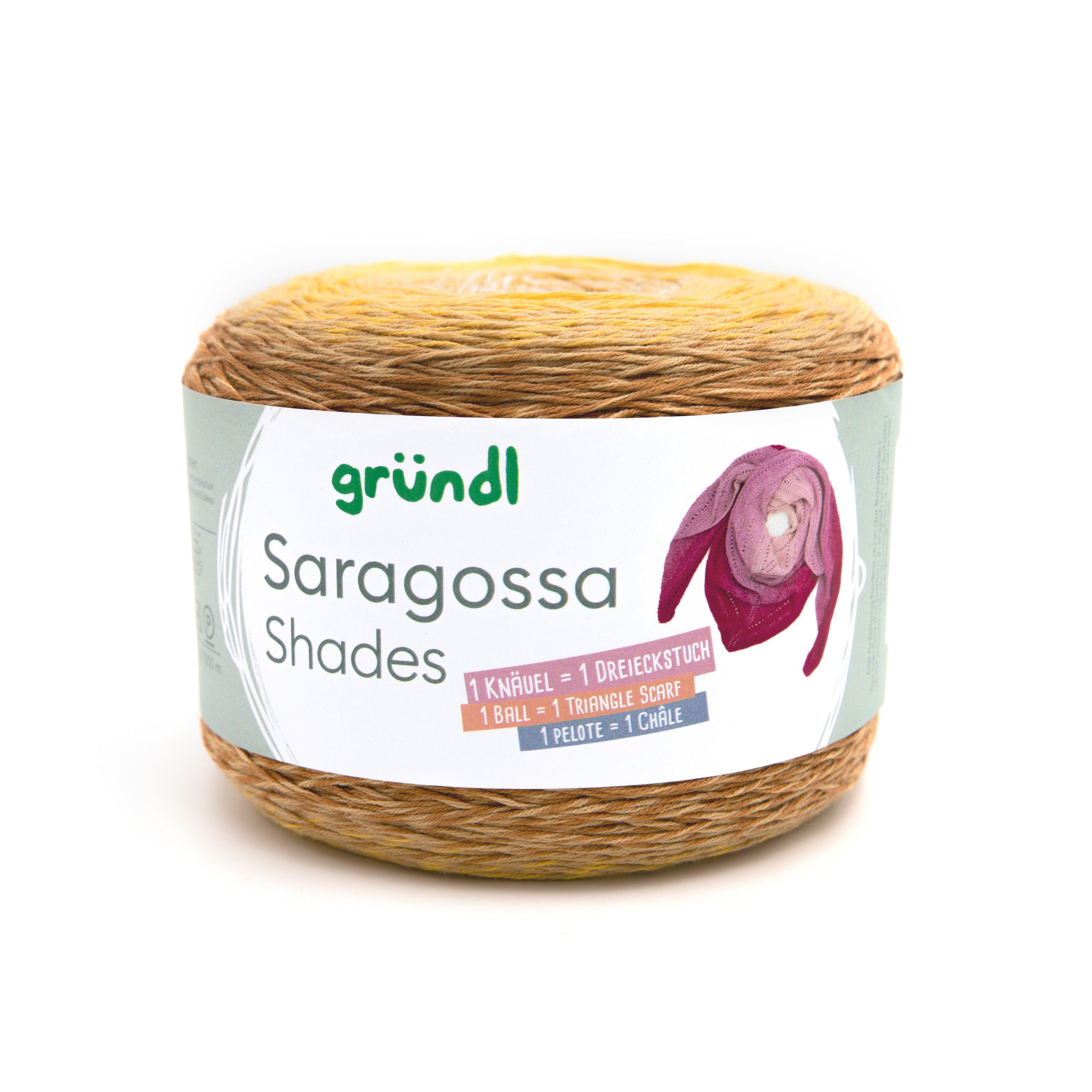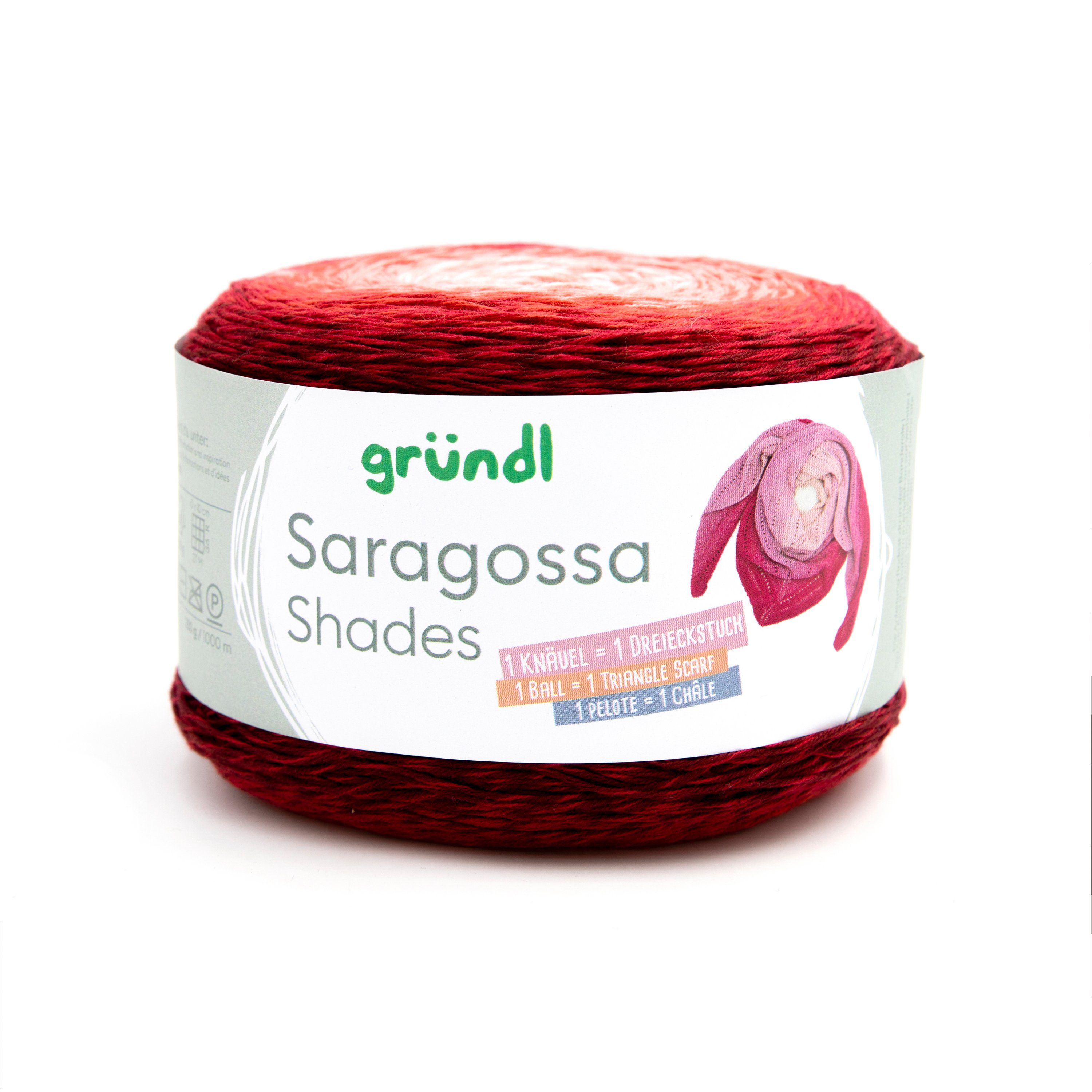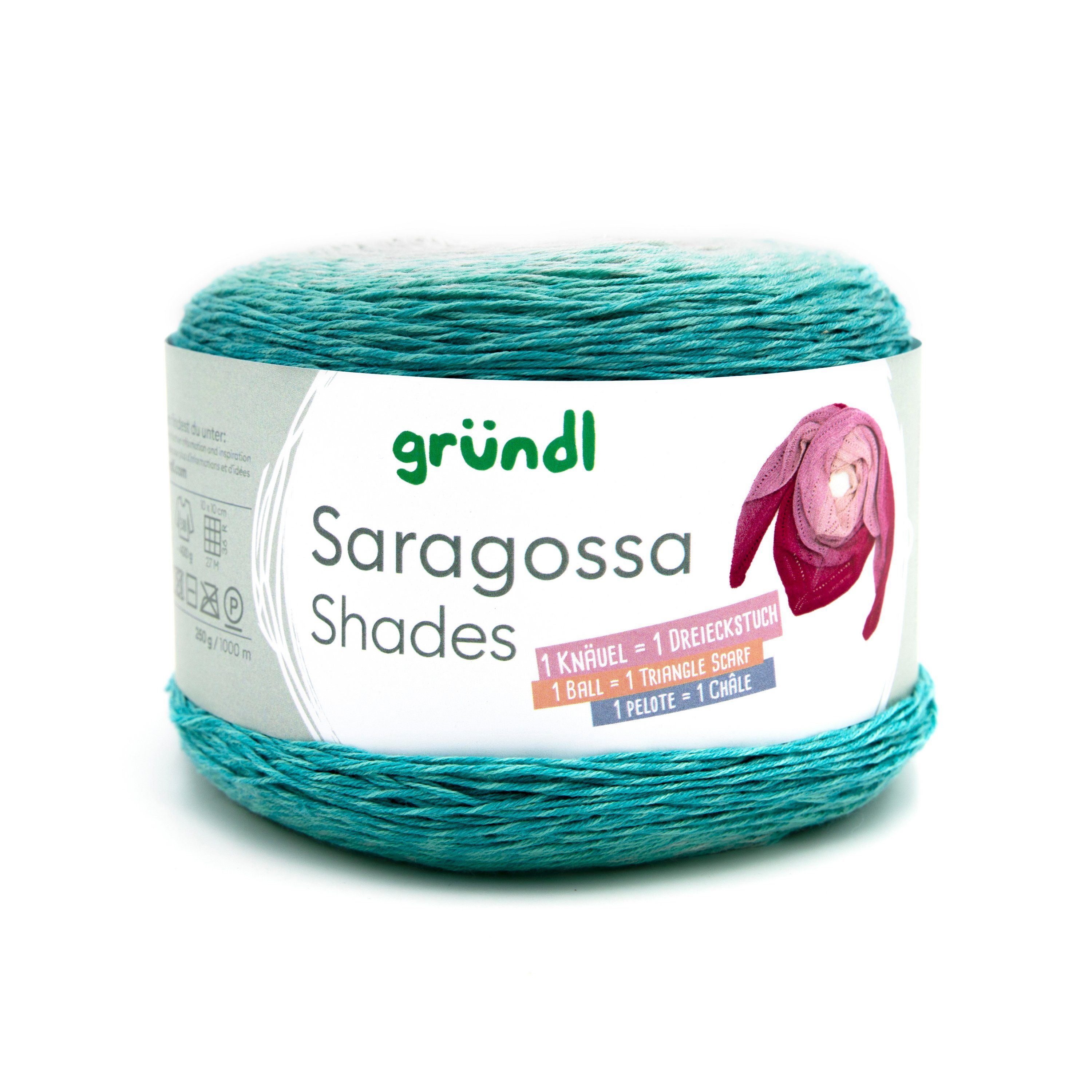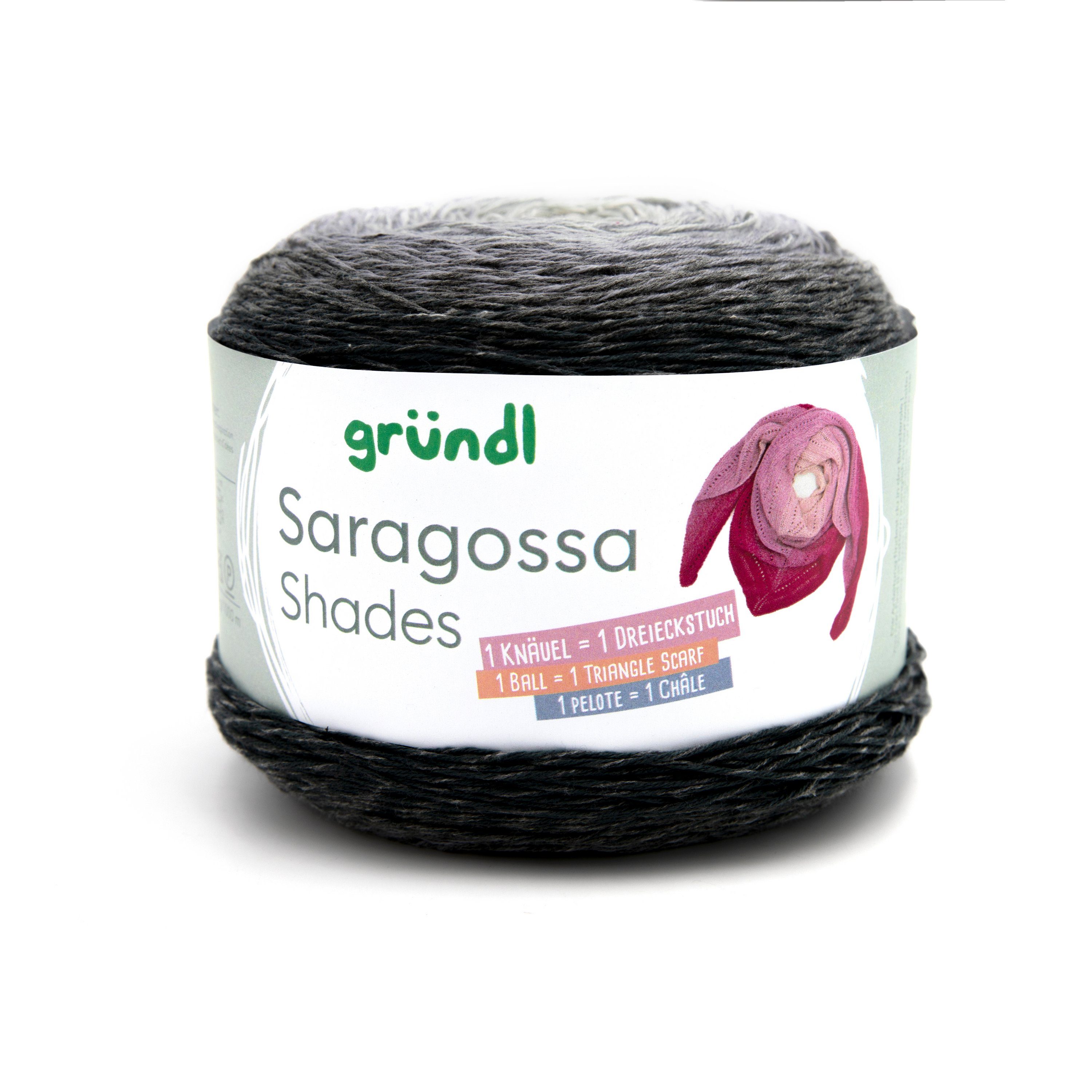 Gründl Saragossa Shades, 250 g mit einer Lauflänge von ca. 1000 m und Farbverlauf von Hell zu Dunkel innerhalb eines Farbtons. Aus einem Knäuel lässt sich ein Dreieckstuch herstellen und für einen Pullover in Размер 38 werden ca. 400 g benötigt. Die Besonderheit dieses 4-fädigen Garns ist, dass die Farbübergänge gespliced und nicht geknotet sind. Toll zu verarbeiten für leichte Schals, Tücher, Pullover, trendige Shirts und Strickjacken. Aus 50 % Baumwolle und 50 % Polyacryl, was sehr angenehm zu tragen ist. Für ein Dreieckstuch befindet sich die Anleitung auf Deutsch auf der Innenseite der Banderole und über den QR-Code sind die Sprachen Französisch und Englisch zu finden.