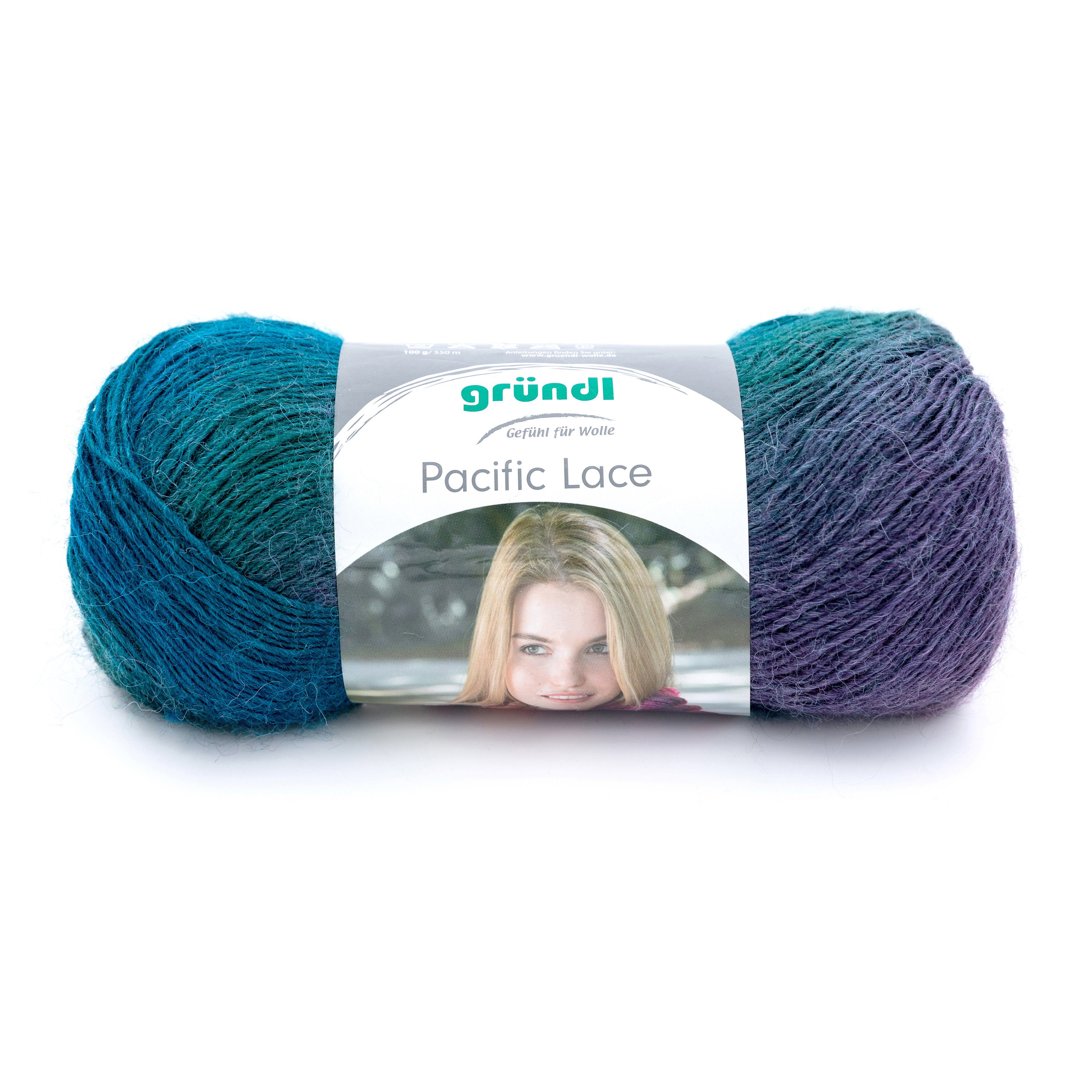 Die Gründl Wolle Pacific Lace ist ein feines Lacegarn mit langem Farbverlauf zum Stricken oder Häkeln für Projekte wie Tücher, Ajourmuster, Lochmuster, leichte Pullis