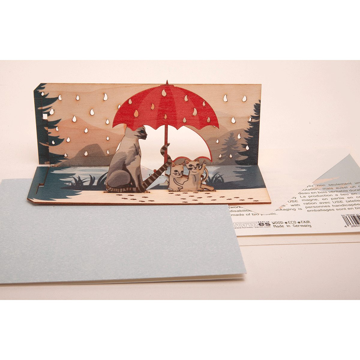 Eine Grußkarte mit Wow-(und Miau-)Effekt. Die besondere Karte bietet gelaserte 3D-Elemente, die herausgetrennt und in kleine Schlitze in der Karte gesteckt werden können. So entsteht ein kleines Diorama mit einer hübschen Szene: eine Katzenmutter mit Regenschirm schützt ihre Jungen in einer regnerischen Landschaft. Ideal für alle Katzenmenschen, aber auch schön als kleines Geschenk oder Mitbringsel zum Geburtstag oder zum Muttertag! Die Grußkarte besteht aus Holz aus nachhaltiger Forstwirtschaft, das sowohl robust als auch umweltfreundlich ist. Das handliche A6-Format macht die Karte perfekt für den Postversand oder als Beigabe zu Geschenken. Im Inneren befindet sich eine Klappkarte aus Papier, die mit Grüßen beschrieben werden kann die Verpackung besteht aus biologisch abbaubarer Folie (PLA). Für den Zusammenbau ist kein Werkzeug oder Kleber nötig alle Teile werden ineinandergesteckt. Die Postkarten stammen übrigens komplett aus Deutschland. Ein Berliner Familienbetrieb produziert seine Post- und Grußkarten aus besonders hochwertigen Materialien und mit neuesten Lasertechniken. Vom Entwurf und der Gestaltung bis hin zum Vertrieb erfolgt die Produktion hauptsächlich in der Werkstatt in Berlin-Kreuzberg. Hilfestellung beim Konfektionieren oder anderen Produktionsschritten leisten den Berliner Designern kooperierende Werkstätten für Menschen mit Behinderung.