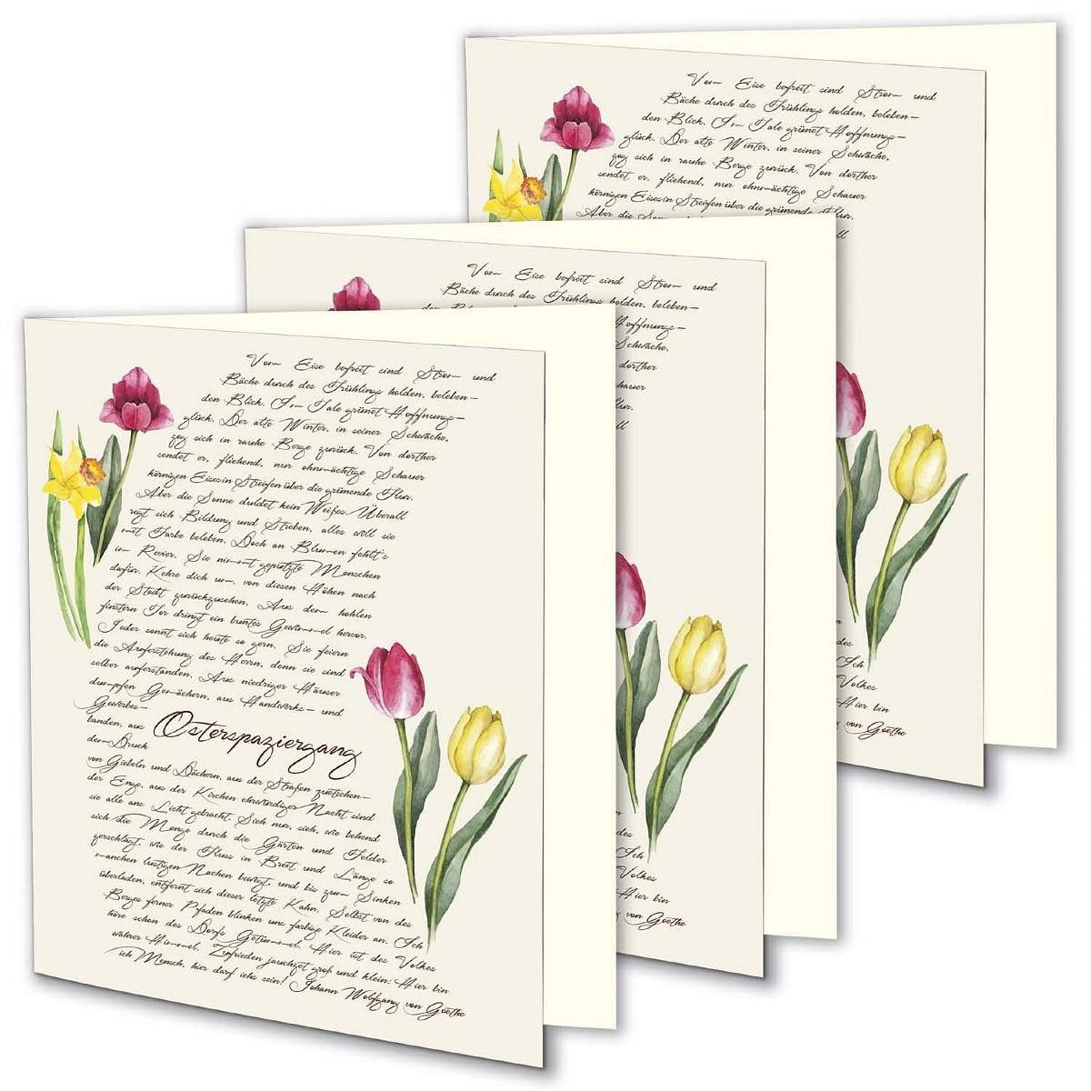 Gleich drei Mal können Sie mit diesen romantisch gestalteten Klappkarten besondere Oster- und Frühlingsgrüße versenden. Elegante Aquarelle beliebter Frühlingsblumen rahmen das wie frisch mit Feder und Tinte geschriebene Ostergedicht von Johann Wolfgang von Goethe ein. So führt der »Osterspaziergang« Ihren Lieben den Frühling auch lyrisch vor Augen. Im Set inbegriffen sind die passenden Umschläge. (3 Klappkarten, je 10,5 × 14,5 cm, inkl. Briefumschlägen) Ø poetische Klappkarten mit dem kompletten Gedicht Ø illustriert mit edlen Tulpen-Aquarellen Ø inkl. Briefumschlägen