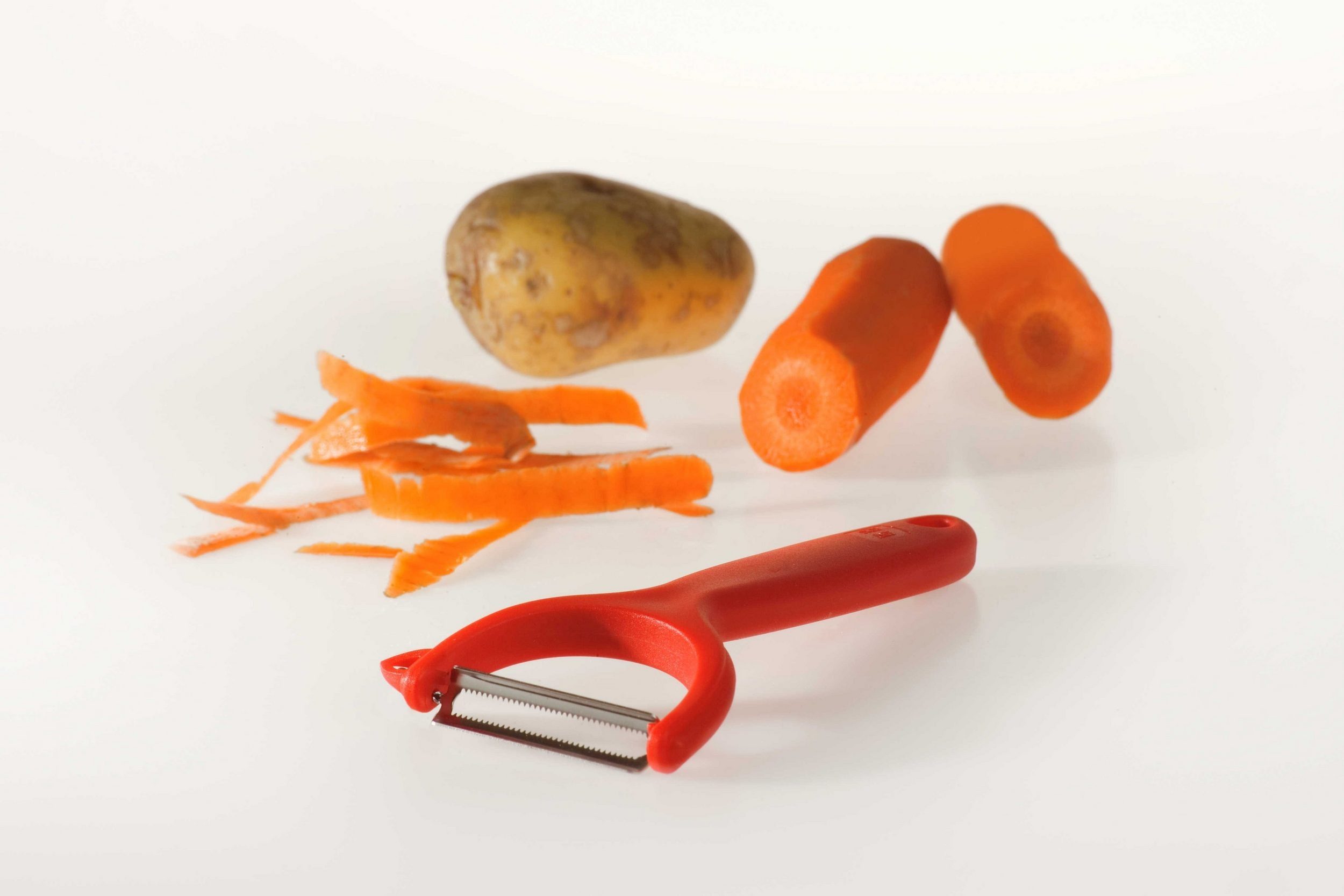 Gemüseschäler mit doppelseitiger Zackenschliffklinge, Klinge rostfrei, schält hauchdünn durch speziellen Zackenschliff, geeignet für Linkshänder.