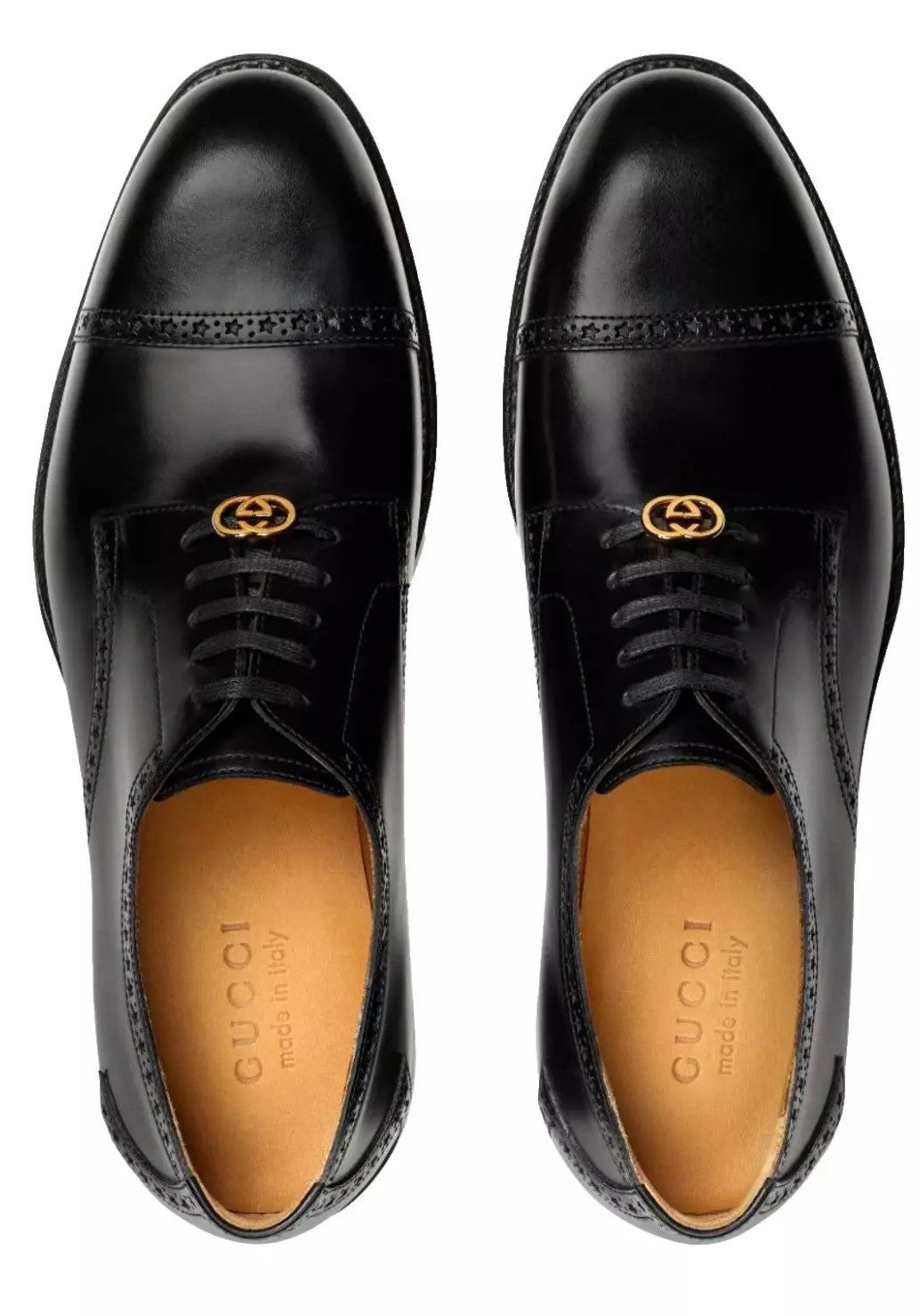 GUCCI Derby-Schuhe aus hochwertigem Leder, die handwerkliche Tradition mit ikonischen Details des Hauses verbinden. Diese Schnürschuhe sind aus erstklassigem Leder gefertigt und mit einem offenen Sternmuster verziert, das den Schuhen eine exklusive Note verleiht. Ein GG-Logo-Detail auf dem Verschluss und filigrane Brogue-Details runden das Design ab. Der Schuh besticht durch seinen Goodyear-Rahmen und eine robuste Leder-Laufsohle, die eine lange Haltbarkeit garantiert. Perfekt für einen zeitlosen und dennoch modernen Stil, der jeden Look aufwertet.
