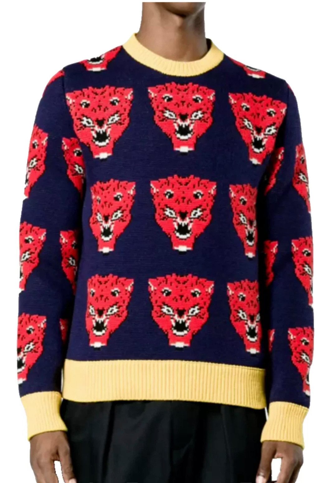 GUCCI Herren Pullover mit Tigerkopf-Motiv – Modell 493651X9E63 Ein echtes Statement-Piece aus der Gucci Kollektion – dieser Rundhalspullover mit auffälligem Allover-Tiger-Motiv ist nicht nur ein modisches Highlight, sondern auch ein Ausdruck von Individualität und mutigem Stil. Material: 100% Wolle (Hochwertiger, angenehm warmer Strick, ideal für Herbst/Winter) Размер & Schnitt: Размер M Regular Fit / Normale Passform Maße bei Gr. M: Brustweite ca. 52 cm – Rückenlänge ca. 67 cm – Ärmellänge ca. 64 cm Besonderheiten: Ein absolutes Must-have aus der Alessandro Michele Ära bei Gucci Ideal kombinierbar mit Jeans, Stoffhosen oder Statement-Sneakers Sammlerstück & Fashion-Favorit für Individualisten Neuwertig mit allen Originaletiketten Gucci wurde 1921 von Guccio Gucci in Florenz gegründet und zählt heute zu den renommiertesten Modehäusern der Welt. Die Marke steht für italienische Handwerkskunst, opulente Designs und eine avantgardistische Stil-DNA. Unter der kreativen Leitung von Alessandro Michele (bis 2022) wurden besonders tierische Motive, Vintage-Referenzen und starke Symbole fester Bestandteil der Kollektionen – wie bei diesem Tigerpulli eindrucksvoll zu sehen.