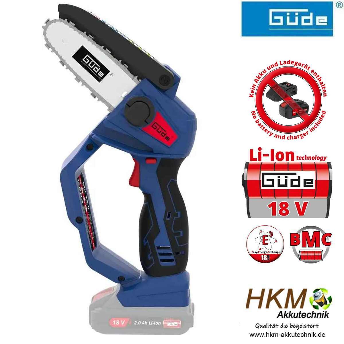 Die Güde Akku-Minikettensäge MK 18-201-05 ist eine leistungsstarke, handliche und vielseitige Einhandsäge zum Beschneiden von Obstbäumen, zum Entasten, sowie jeglicher Gehölzpflege ums Haus und im Garten. Im Lieferumfang enthalten sind; ein 2,0 Ah-Akku, das passende Ladegerät, sowie ein Qualitätsschwert und eine hochwertige Kette mit langer Standzeit. Die Einhandkettensägen überzeugt durch angenehme Haptik, einem vibrationsarmen und hocheffizienten Elektromotor sowie durch das geringe Gewicht, für ein ermüdungsarmes Arbeiten mit einer Hand. Durch den oberen Ketten-Sicherheitsschutz und den Handschutz werden die Hände bestmöglich vor Verletzungen geschützt.